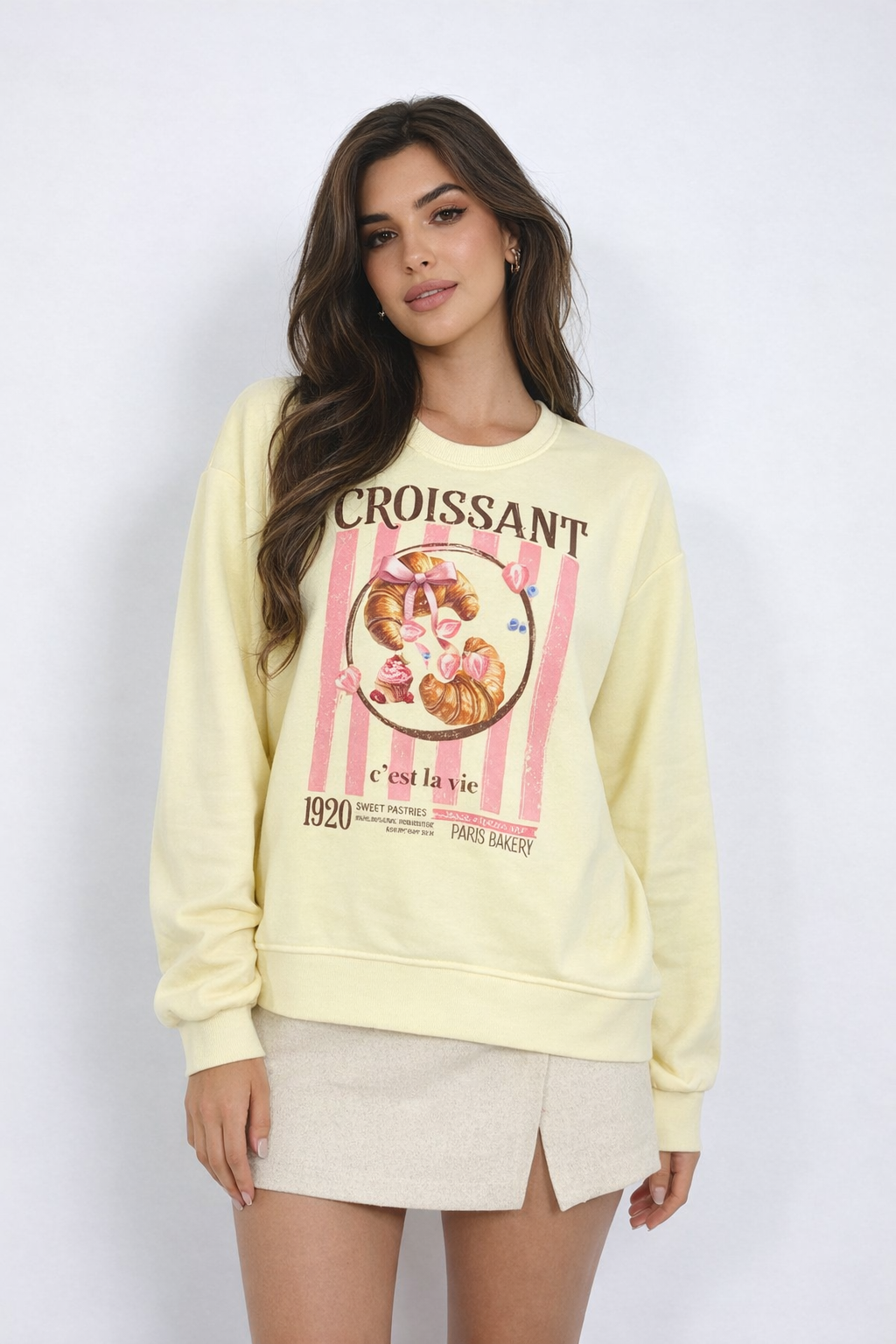 Efektowny nadruk z motywem croissanta, delikatnymi kwiatami oraz francuskim hasłem „c’est la vie” nadaje całości wyjątkowego charakteru i przyciąga wzrok. Bluza doskonale prezentuje się zarówno w zestawieniu z jeansami, legginsami, jak i spódnicą czy szortami – tworząc stylowy, nowoczesny look.