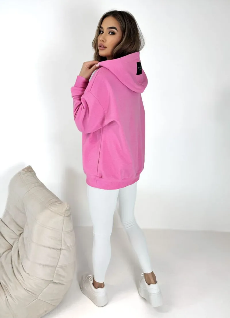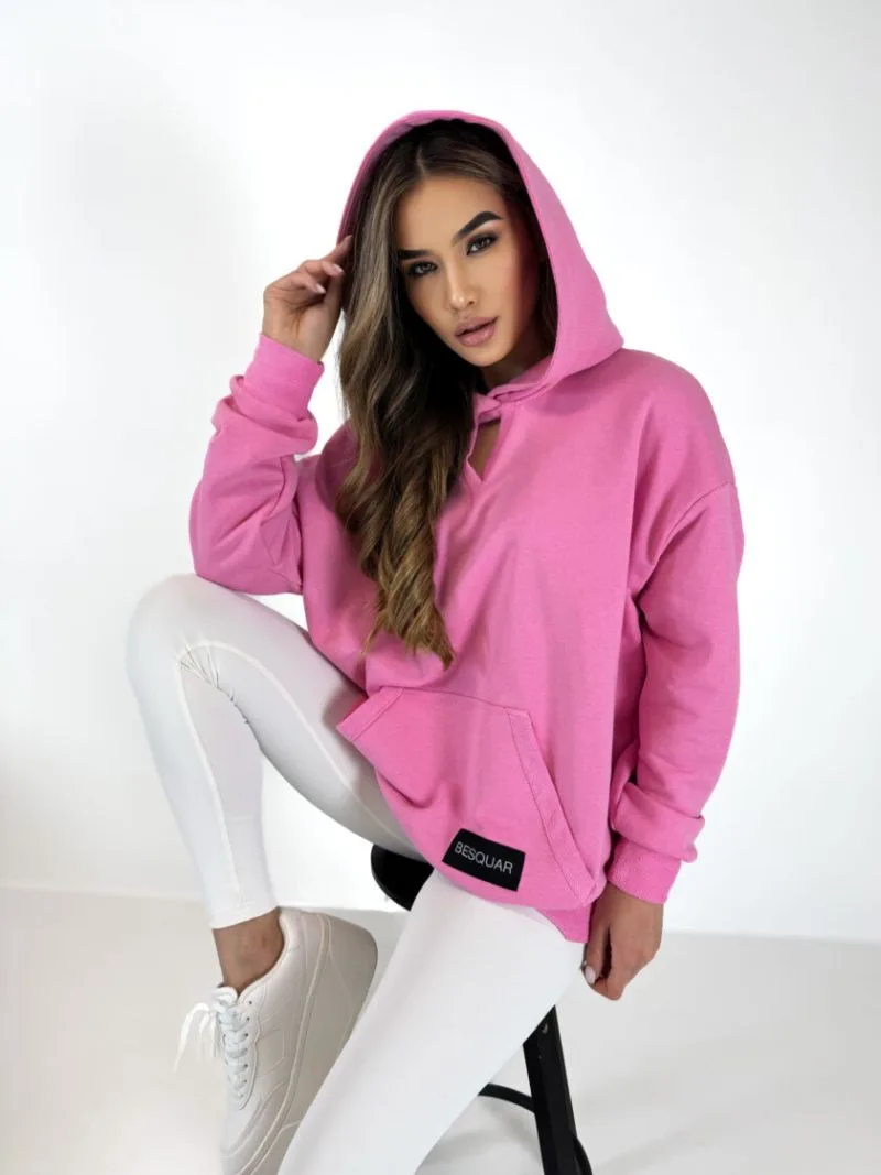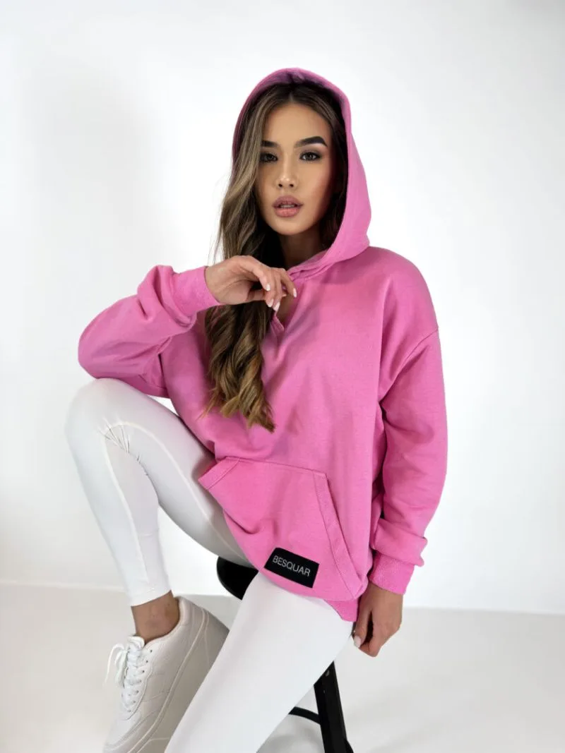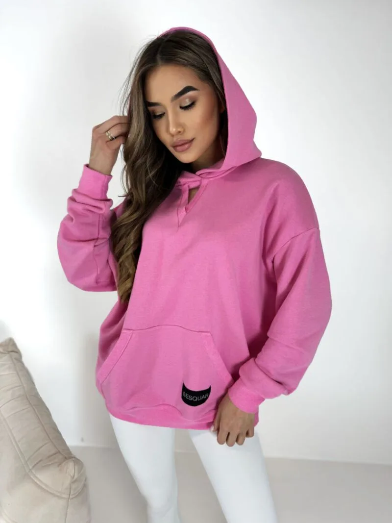 Bluza z kapturem różowa Besquar o OVERSIZOWYM kroju typu kangurka z ozdobnymi naszywkami z logo „BESQUAR”