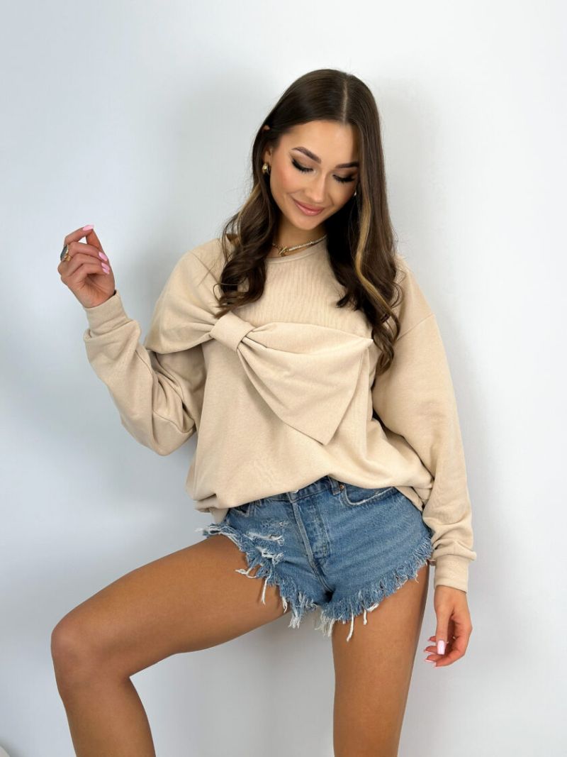 Bluza z kokardą beżowa to bluza o oversizowym kroju wykonana z wysokogatunkowej bawełny z certyfikatem Oeko-tex, posiada dużą ozdobna kokardę. Rozmiar pasuje od XS do XL.