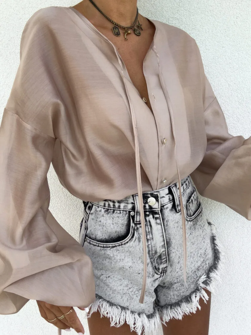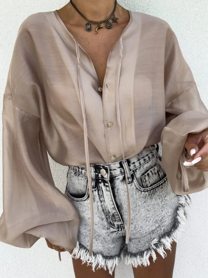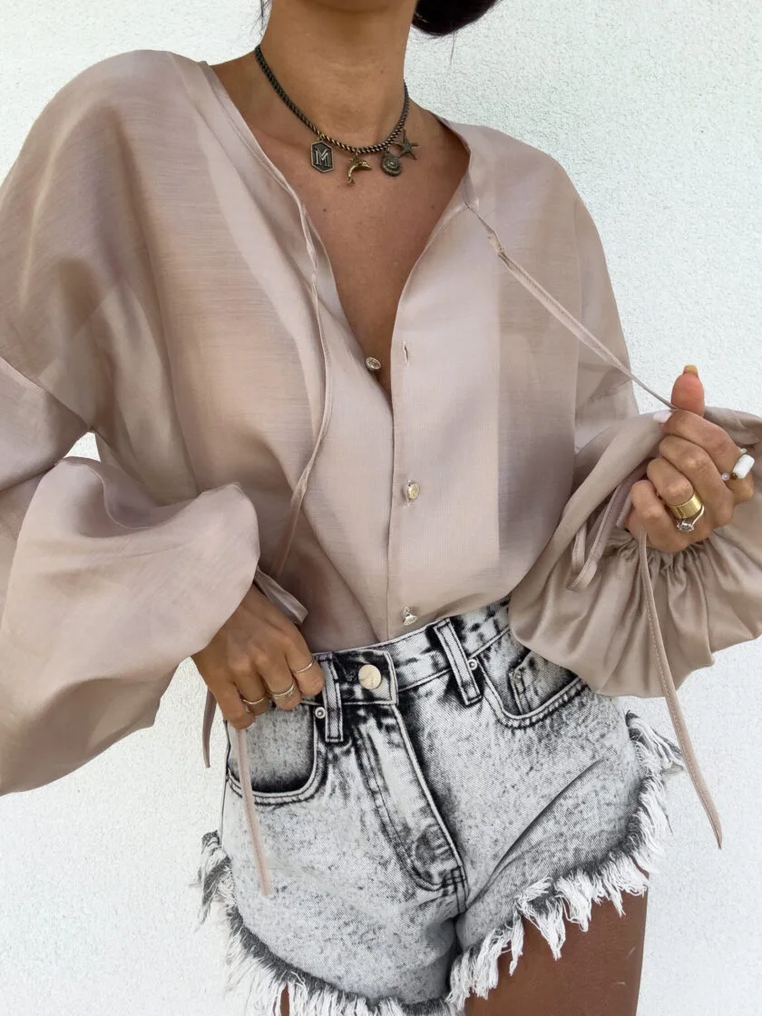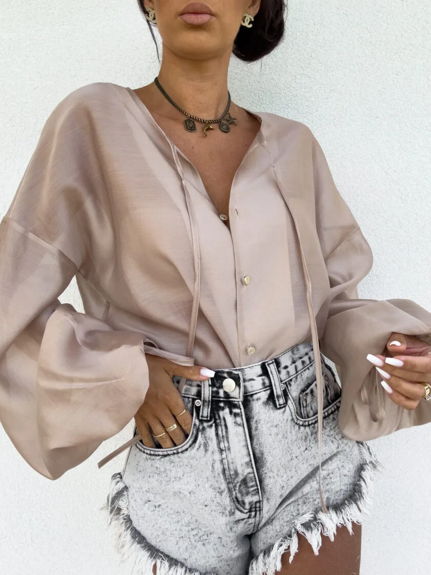 Bluzka boho beżowa – luźny fason typu oversize to gwarancja wygody i swobody ruchów, a jednocześnie modny akcent w każdej stylizacji. Bluzka posiada dekolt z uroczym wiązaniem na troczki, które dodają całości lekkości i romantycznego charakteru. Bufiaste rękawy zakończone wiązaniem na troczki tworzą efektowną formę. Idealna do jeansów, spodni z wysokim stanem lub spódnic — na co dzień i na specjalne okazje.