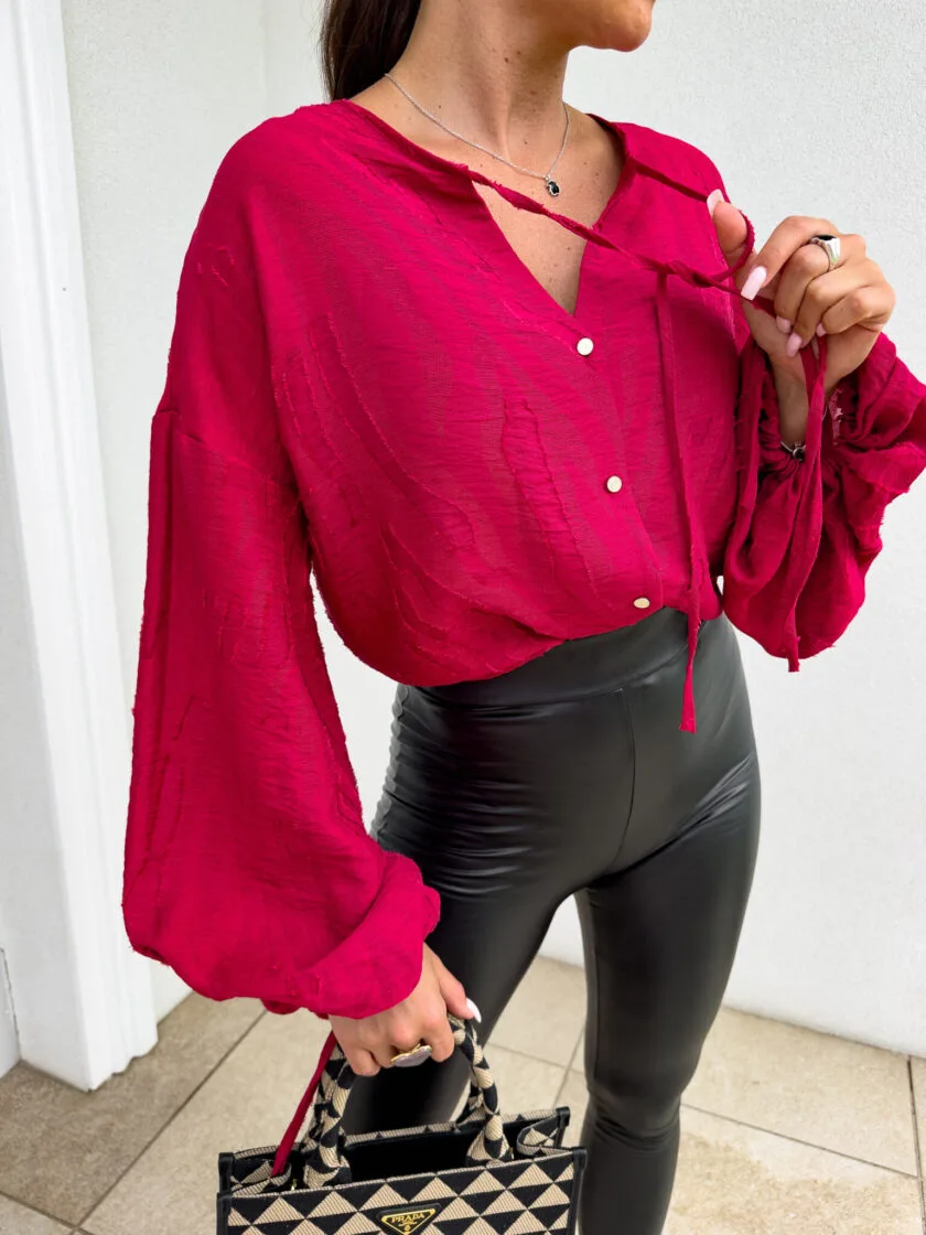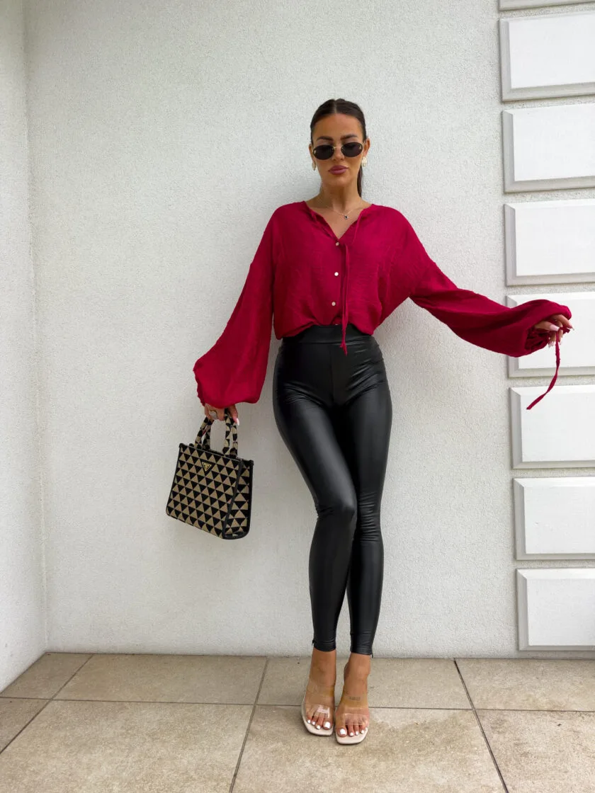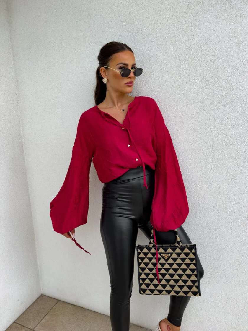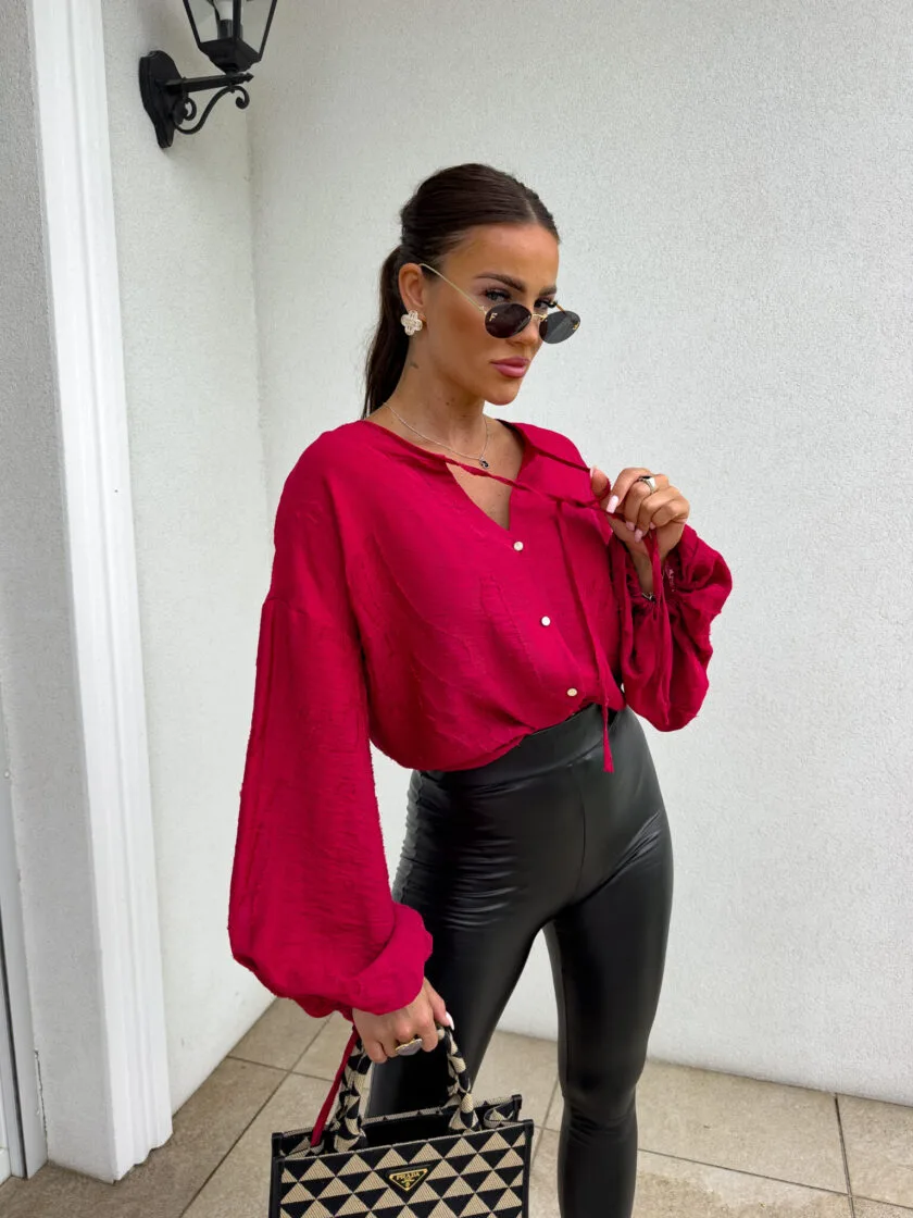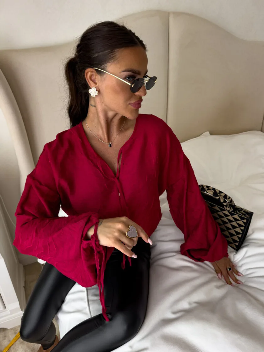 Bluzka boho czerwona – luźny fason typu oversize to gwarancja wygody i swobody ruchów, a jednocześnie modny akcent w każdej stylizacji. Bluzka posiada dekolt z uroczym wiązaniem na troczki, które dodają całości lekkości i romantycznego charakteru. Bufiaste rękawy zakończone wiązaniem na troczki tworzą efektowną formę. Idealna do jeansów, spodni z wysokim stanem lub spódnic — na co dzień i na specjalne okazje.