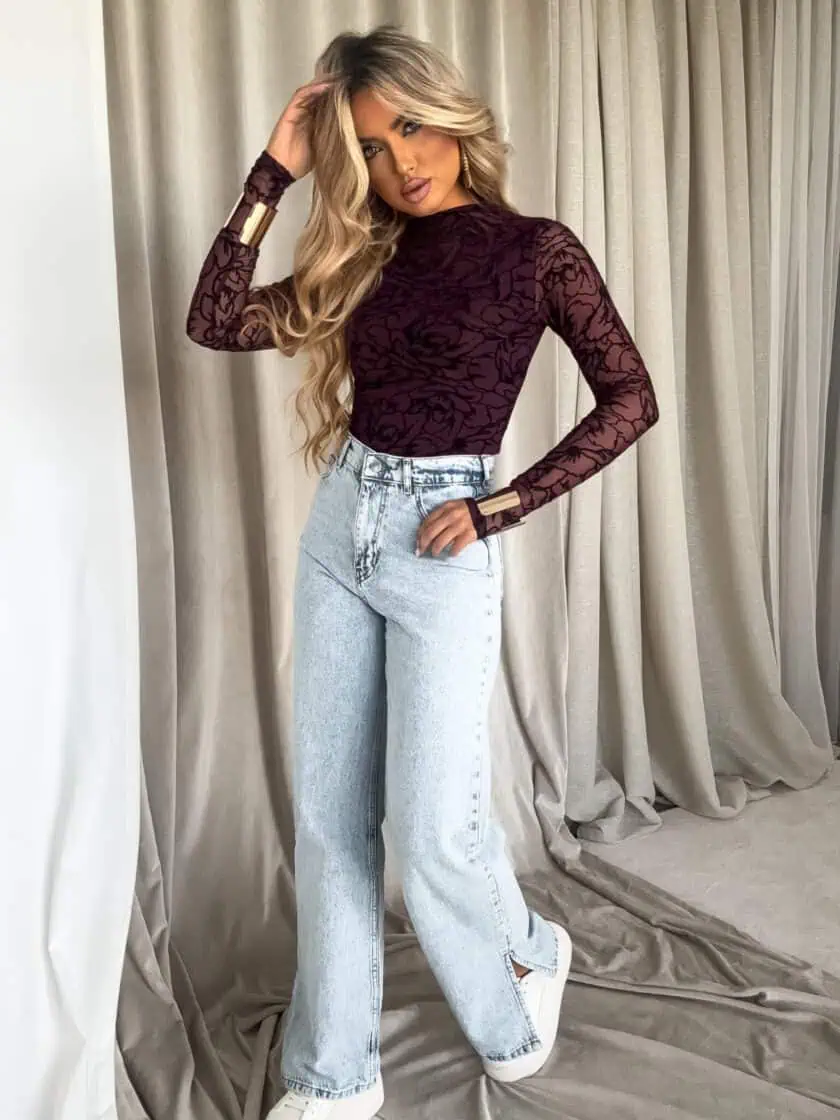 Bluzka By Me Skin Transparent ROSE bordowa o dopasowanym kroju sprawdzi się jako baza do wielu różnorodnych stylizacji. Wykonana z bardzo delikatnej, miłej w dotyku siateczki. Przód i tył z delikatną podszewką, dzięki której nic nie prześwituje. Charakteryzuje się rękawem typu long sleeve.  Jej krój zagwarantuje komfort i wygodę noszenia. Bluzka z siateczką od By Me posiada delikatną stójkę. Stonowana, spokojna kolorystyka sprawdzi się w wielu stylizacjach. Model dostępny w trzech kolorach – bordowym, czarnym oraz czekoladowym.