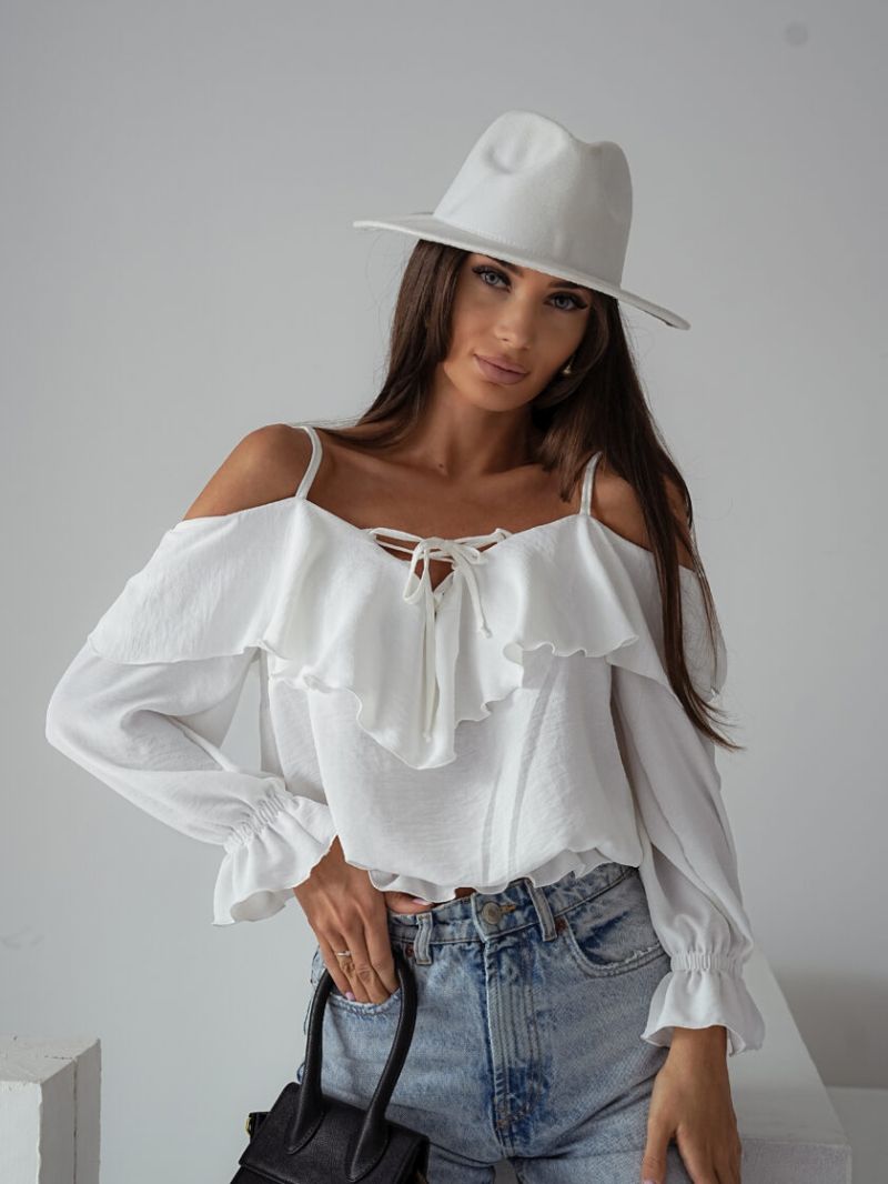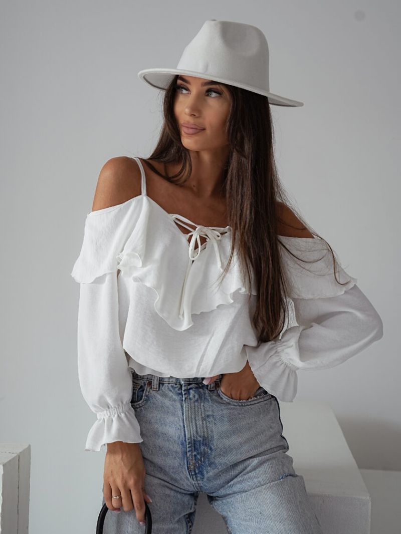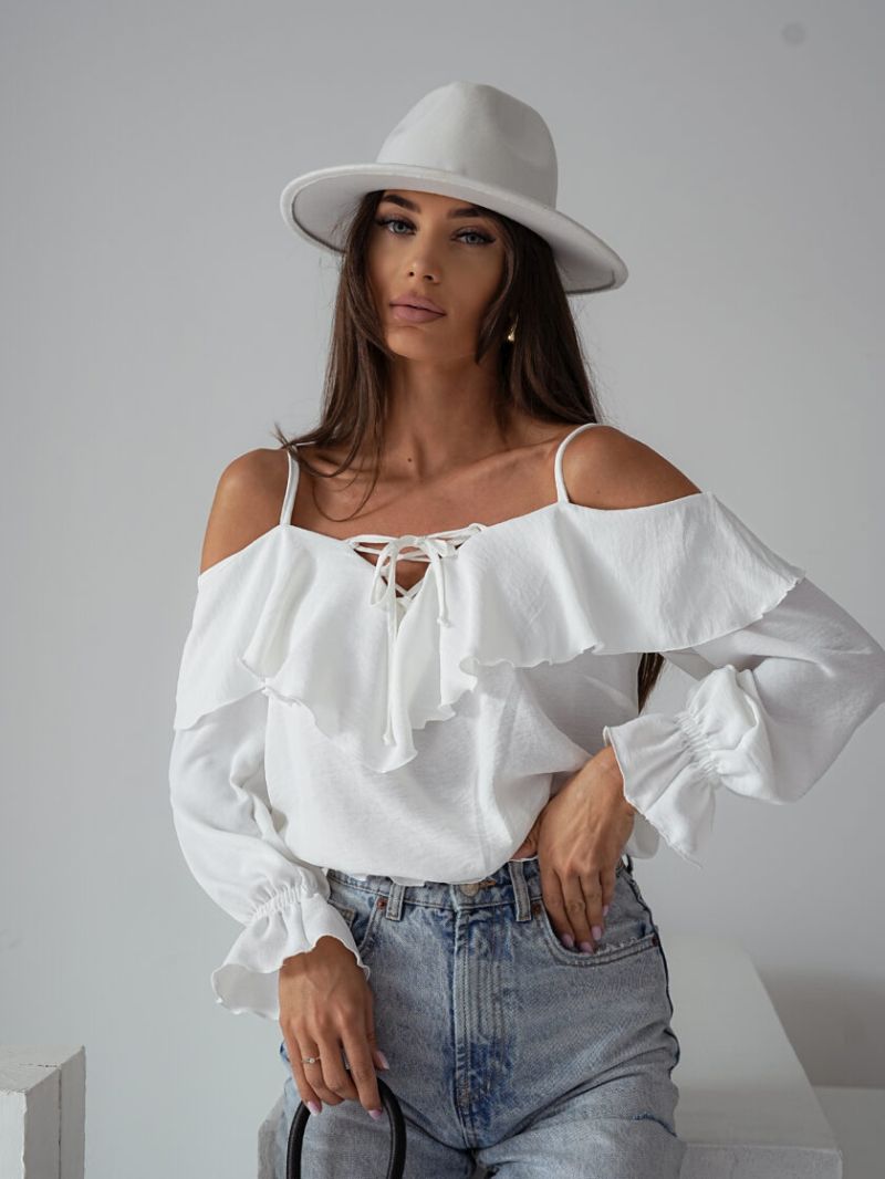 Bluzka hiszpanka z długim rękawem biała wykonana z przewiewnej wiskozy z dodatkiem elastanu. Bluzka hiszpanka z długim rękawem posiada falbankę przy dekolcie oraz falbanki na rękawach. Zakończona jest w pasie gumką.