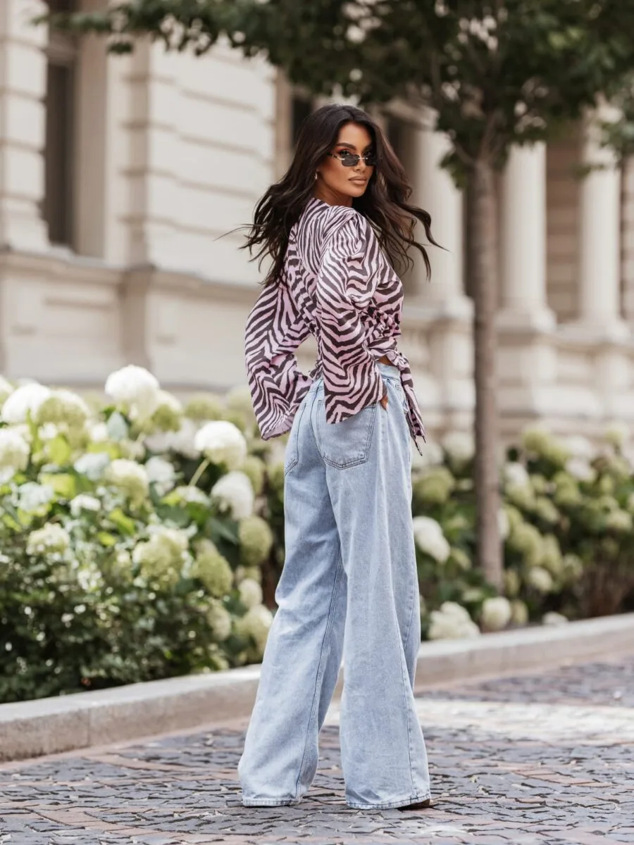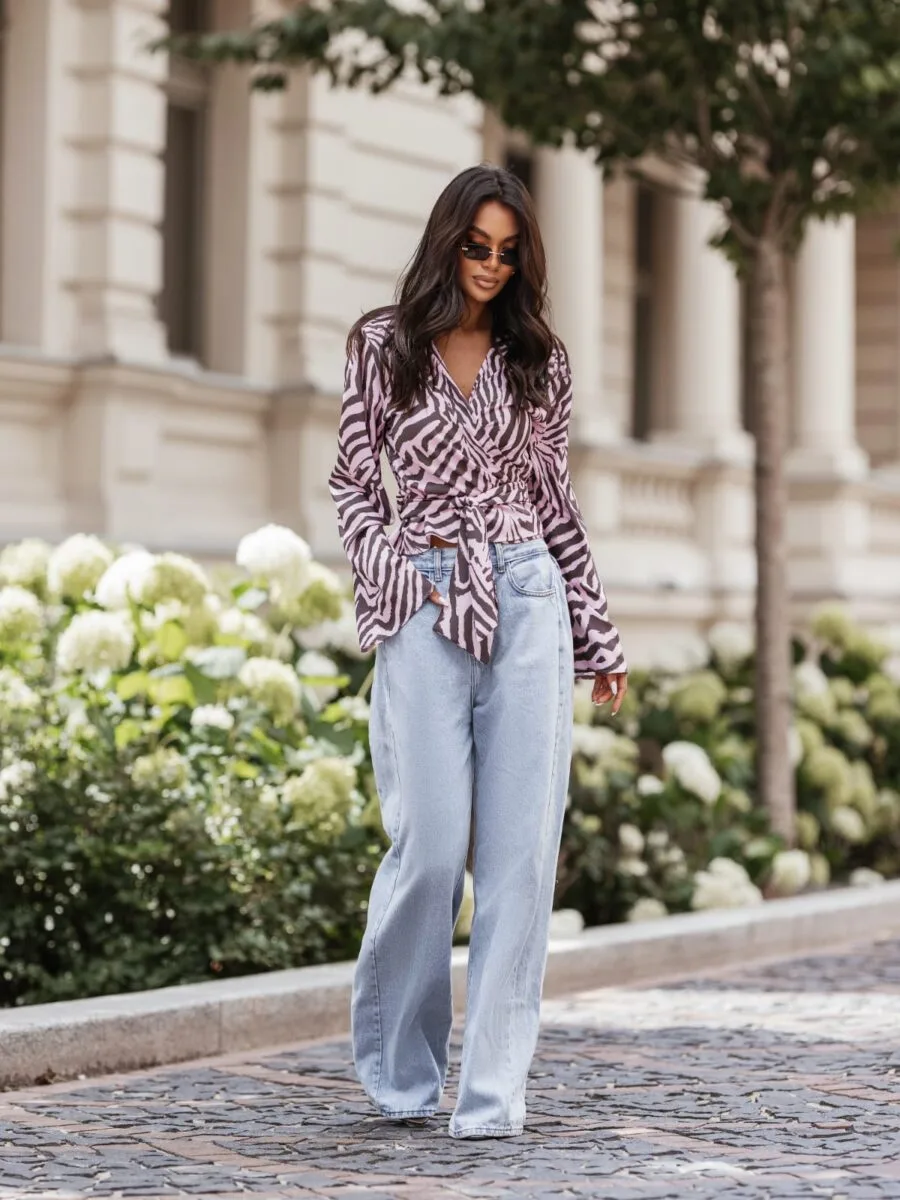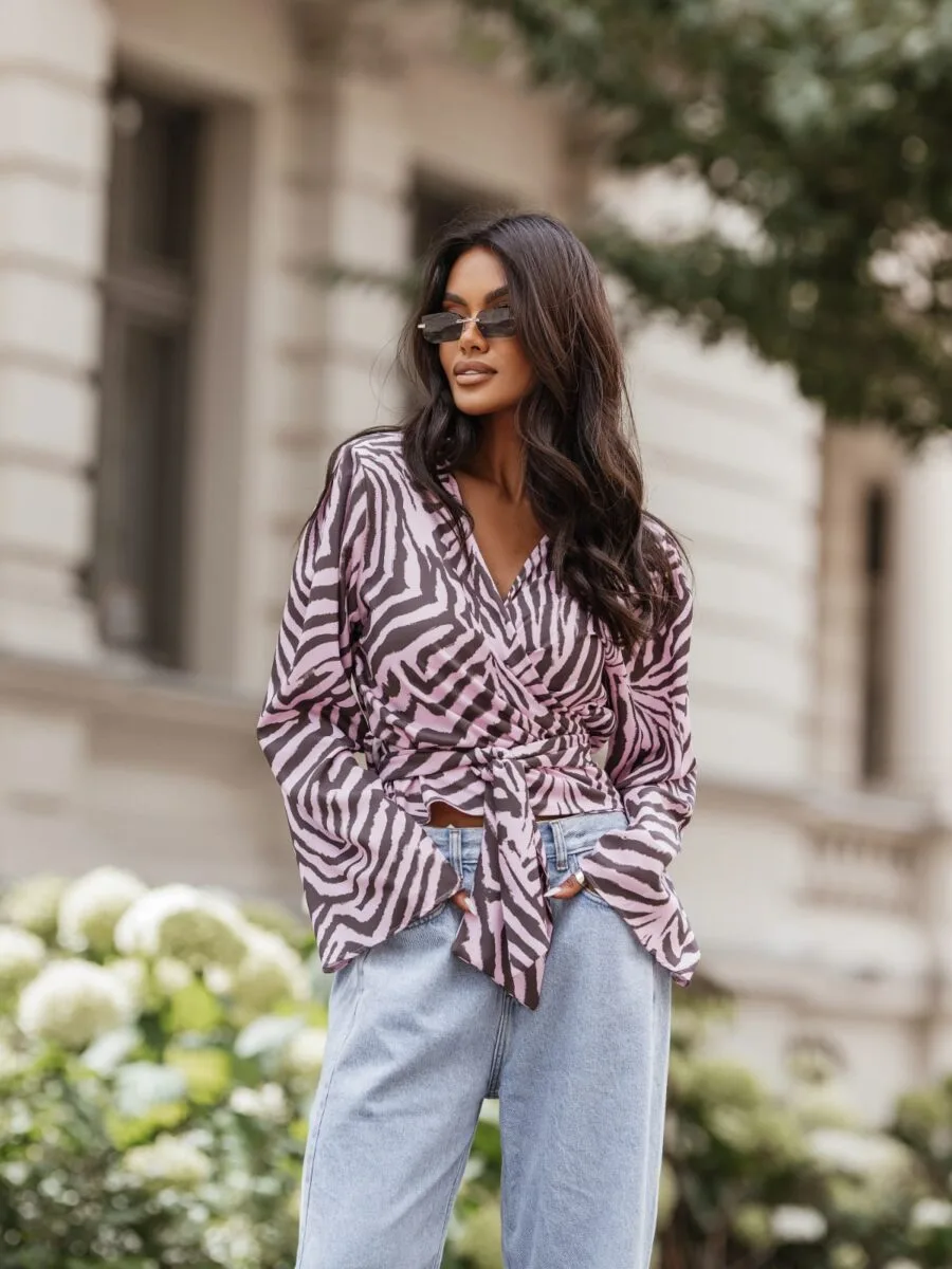 Stylowa bluzka o kroju kopertowym z efektownym wiązaniem w talii i modnymi poduszkami na ramionach, które podkreślają sylwetkę. Wykonana z lekkiego, przyjemnego w dotyku materiału, ozdobiona wzorem zebra w odcieniach beżu, czerni i różu. Rozszerzane rękawy nadają jej lekkości i swobody. Idealna zarówno do jeansów, jak i eleganckich spodni czy spódnic.