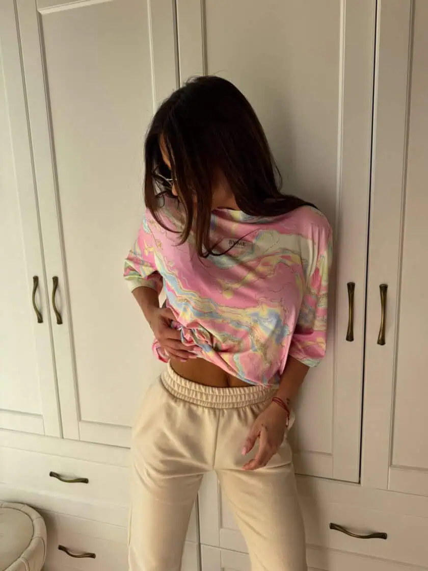 Stylowa i wyjątkowa bluzka Marmaris w print marmurek w odcieniach jasnego różu to propozycja dla kobiet, które lubią modne, ale wygodne stylizacje. Subtelny, marmurkowy wzór przyciąga uwagę i nadaje całości nowoczesnego, lekko artystycznego charakteru.