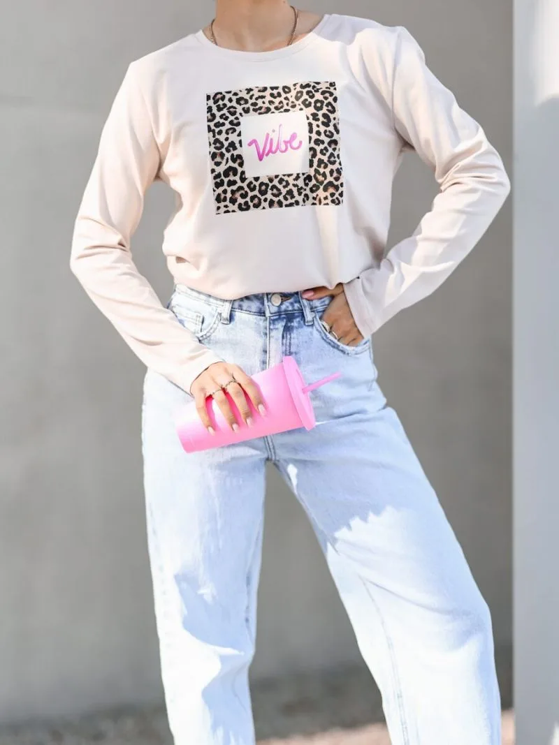 Bluzka panterka Vibe beżowa to bluzka basic z modnym nadrukiem w panterkę, który wpasowuje się w aktualne trendy. Krój bluzki jest klasyczny, okrągły dekolt.