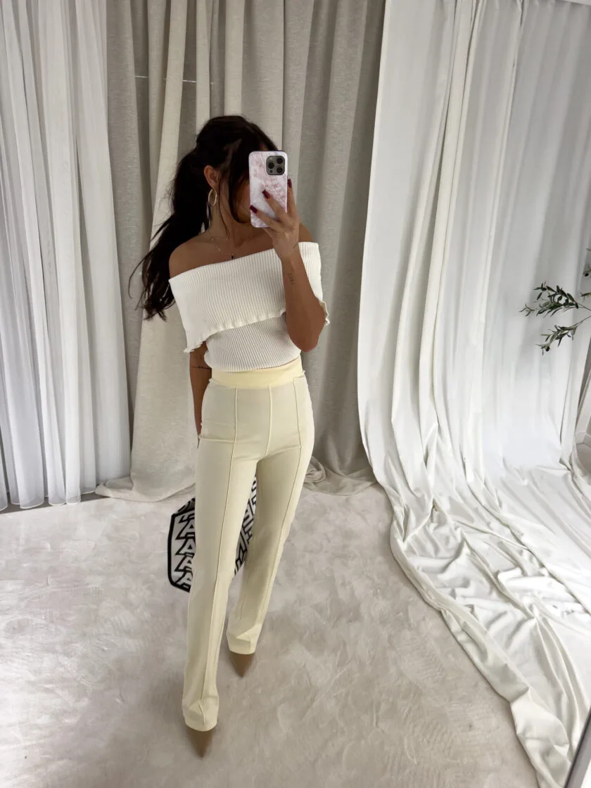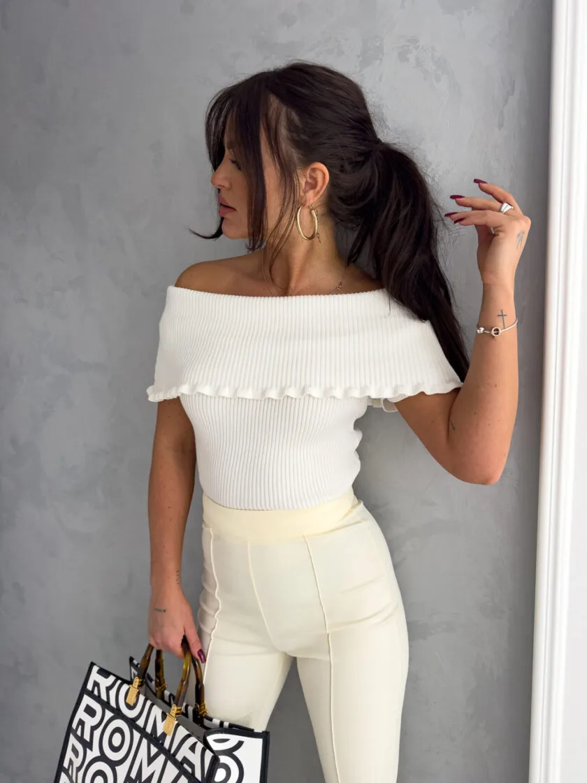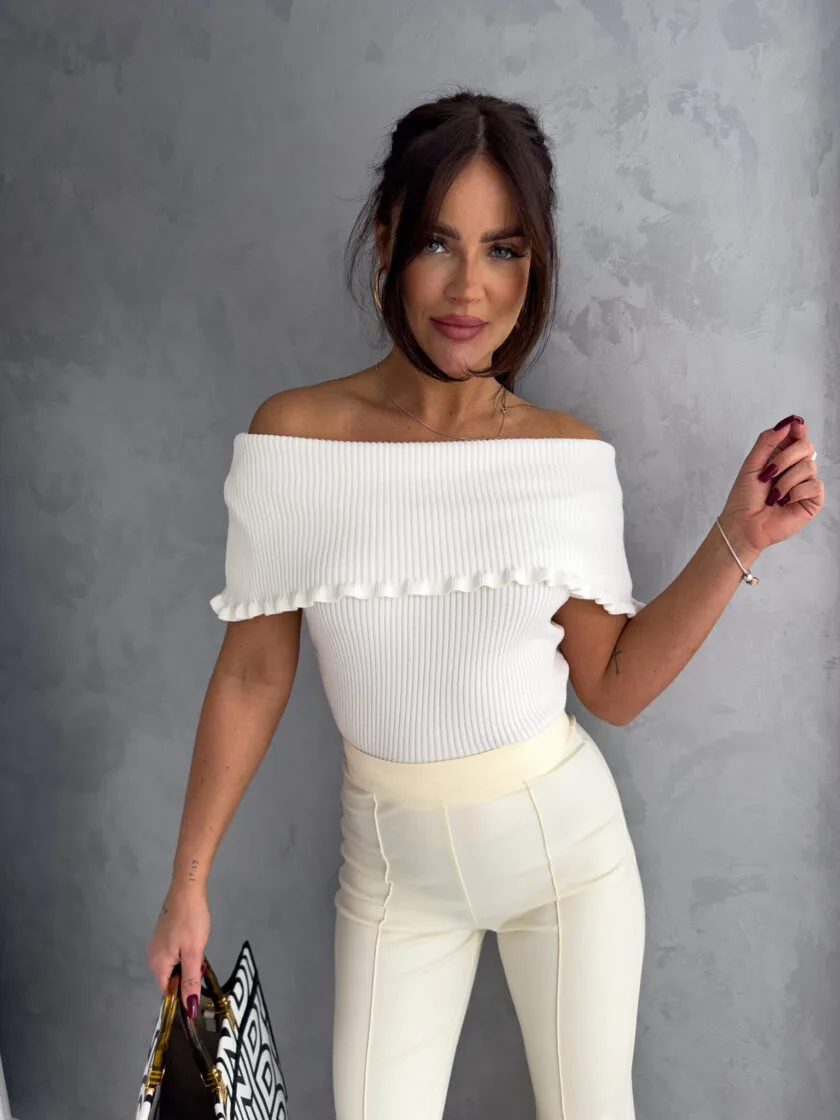 Bluzka sweterkowa ecru Rose to niezwykłe połączenie nietuzinkowego designu, wyjątkowej jakości przędzy z luksusowym dotykiem kaszmiru. Wykonany z dbałością o detale prążkowany splot nadaje mu wyrafinowania i przyciąga uwagę. Uszyty z najwyższej jakości materiału, dzięki czemu jest miękki i niezwykle przyjemny w dotyku. Efektowny wywinięty dekolt, wykończony falbanką oraz nadaje mu kobiecego uroku i subtelności. Świetnie skomponuje się zarówno z eleganckimi spodniami, jak i jeansami, czy spódnicami, co sprawia, że jest idealnym wyborem na różne okazje. Idealny dla kobiet ceniących sobie elegancję, wygodę, jakość i oryginalny design.