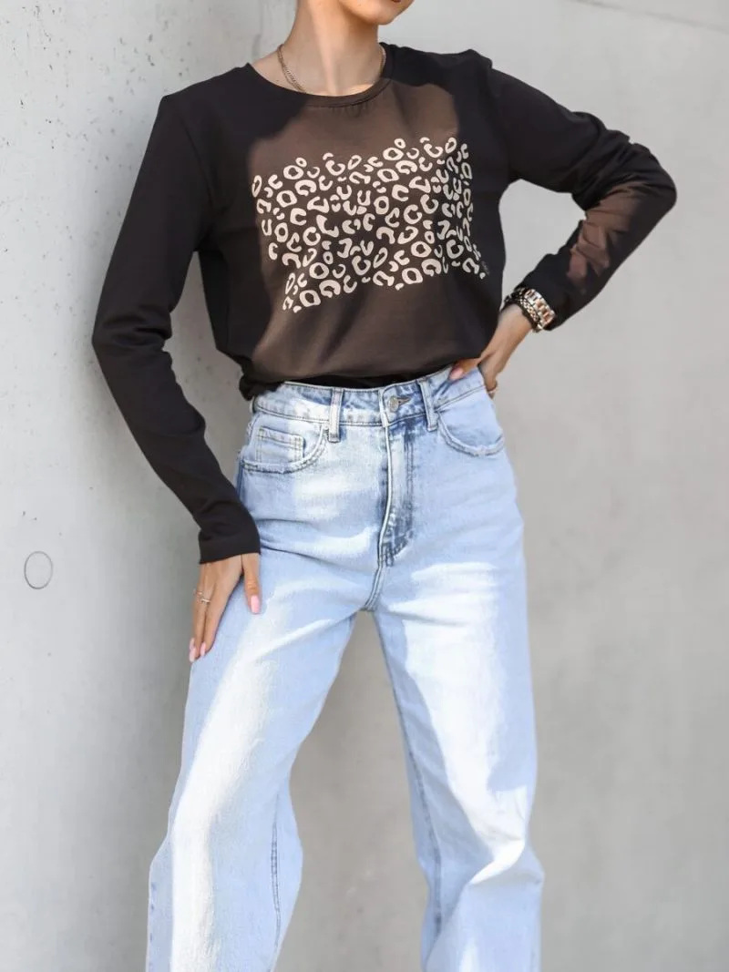 Bluzka z długim rękawem panterka brązowa to bluzka basic z modnym nadrukiem w panterkę, który wpasowuje się w aktualne trendy. Krój bluzki jest klasyczny, okrągły dekolt.