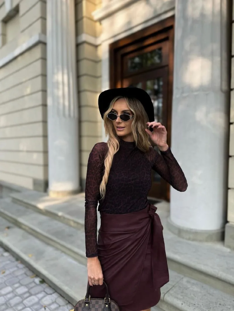 Bluzka z siateczką w panterkę bordo – najmodniejszy wzór tego sezonu, z długim rękawem z lekkim półgolfem. Rękawy wykonane z siateczki. Fason i wzór bluzki są niezwykle kobiece i subtelne. Bluzka z siateczką w panterkę została wyprodukowana w Polsce. Dostępna jest w rozmiarze uniwersalnym.
