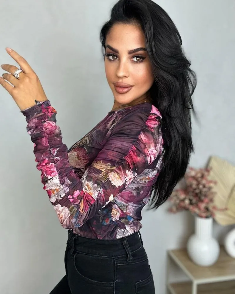 Bluzka z siatki w bordowe kwiaty z transparentnymi rękawami, o dopasowanym kroju. Bluzka posiada podszewkę, dzięki czemu nie prześwituje. Rękawy z marszczeniem. Fason dostępny w kilku wersjach ze wzorem oraz w wersji gładkiej, bez printu.