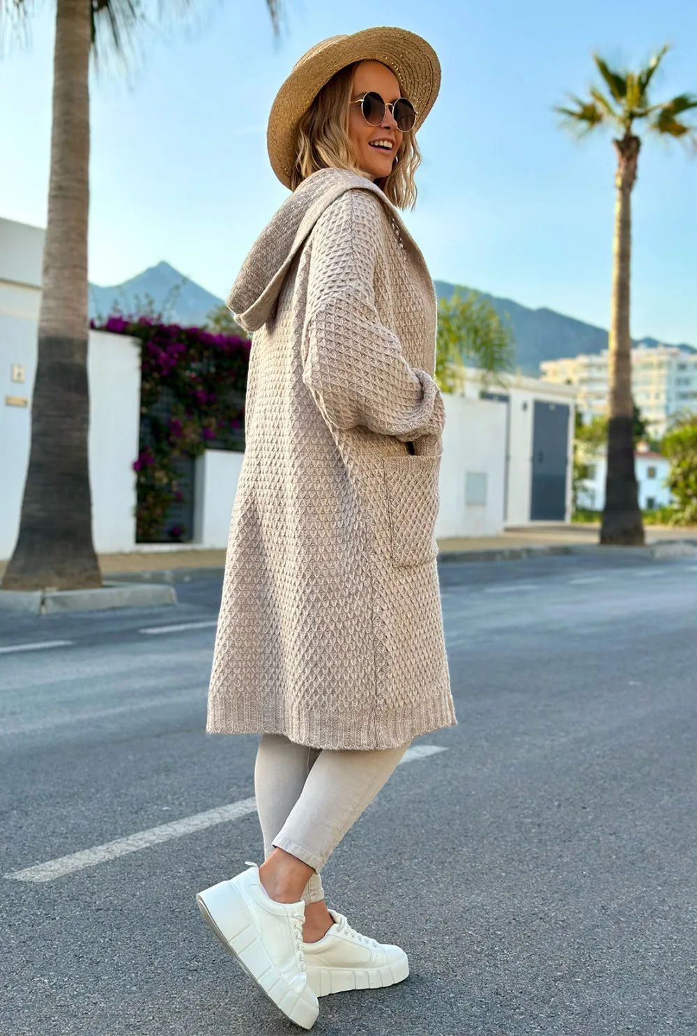 Długi kardigan z kapturem beżowy Luise to cienki kardigan z praktycznymi kieszeniami i kapturem. Model wykonany z oryginalnego splotu przypominający plastry miodu. Idealnie dopełni każdą stylizację – sprawdzi się do szortów jeansowych, legginsów i jako narzutka na sukienkę.