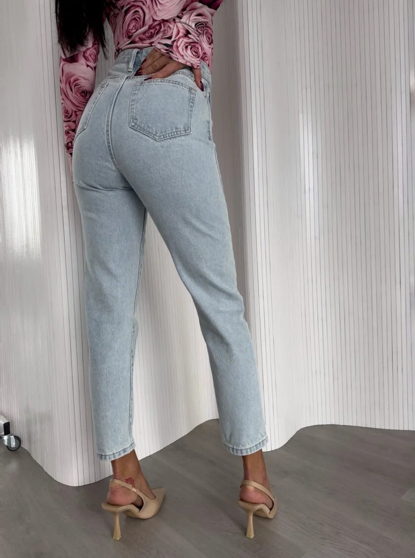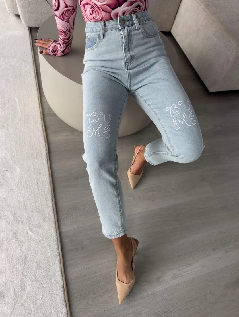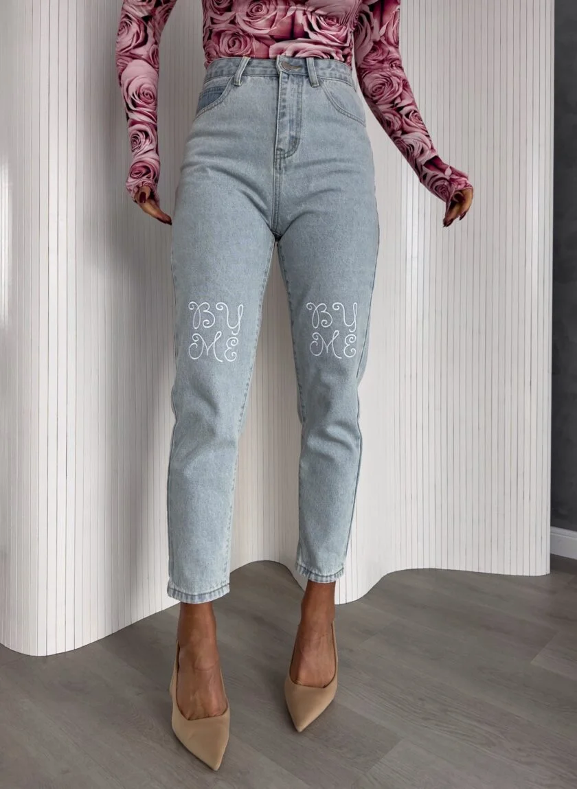 Jeansy MOM FIT By Me nie są elastyczne. Mają genialny krój, posiadają piękne hafty nad kolanami. Naszywka z tyłu. Posiadają szlufki. Model dostępny w kilku wariantach kolorystycznych – klasyczne jeansowe jasnoniebieskie, klasyczne z haftem z logo marki, jasno beżowe, ciemno beżowe.