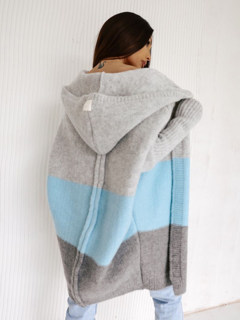 Niezwykle wygodny i ciepły kardigan z miękkiej, przyjemnej dla ciała przędzy. Piękna kolorystyka. Rękawy zakończone ściągaczem, ozdobny szew na plecach i obszerny kaptur. Obowiązkowy model w każdej szafie! Fason oversize.