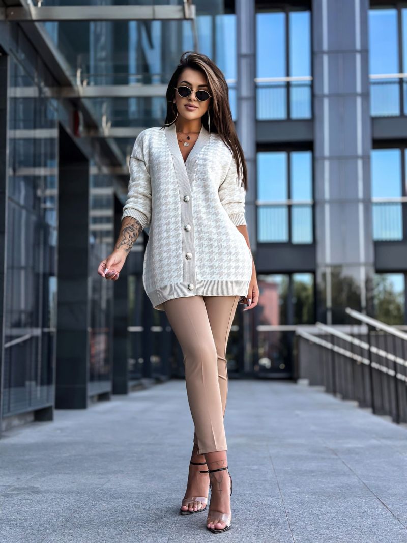 Kardigan w pepitkę w odcieniach jasnego beżu zapinany na cztery ozdobne złote guziki. Rozpinany sweter o dłuższym kroju sprawdzi się idealnie jesienią jako uzupełnienie wielu stylizacji,