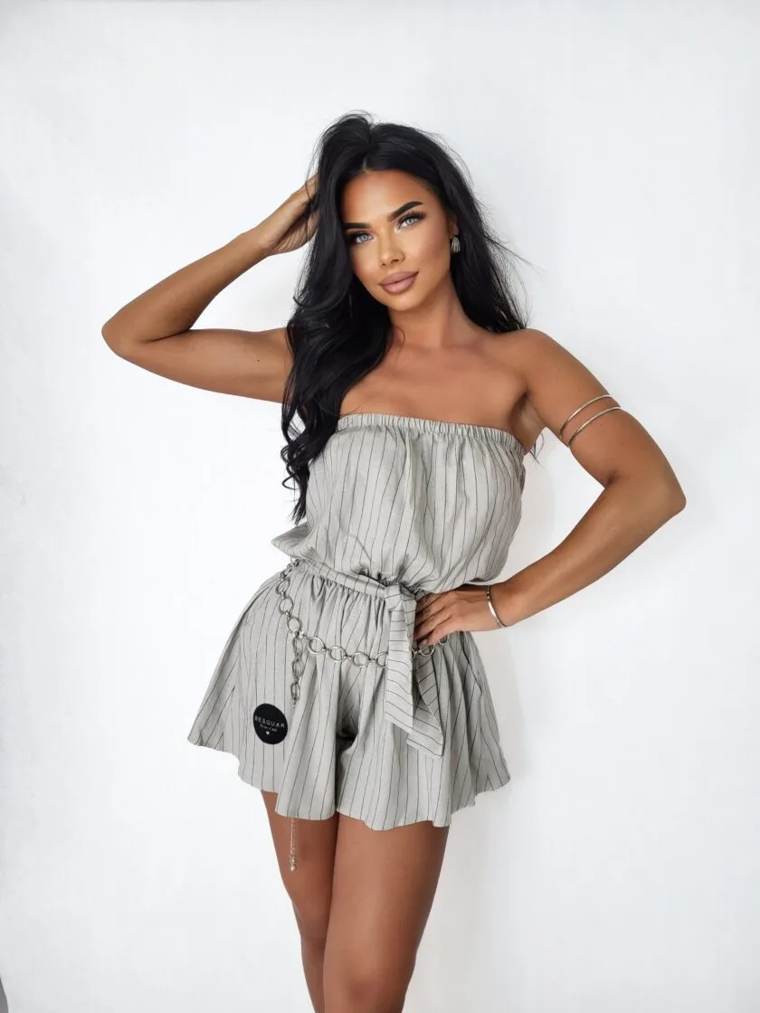 Kombinezon lniany beżowy Lilly w delikatne paseczki to idealna propozycja wakacyjna. Posiada wygodny, długi, szeroki pasek oraz ozdobną naszywkę z logo marki besquar na nogawce. Kombinezon jest niezwykle wygodny, a przy tym elegancki dzięki klasycznym kolorom i delikatnym wzorom. Materiał, z jakiego został uszyty to len, dzięki, czemu będzie świetnym wyborem na letnie wyjazdy wakacyjne, letnie wyjścia wieczorne ze znajomymi lub na randkę. Kombinezon dostępny jest w trzech klasycznych kolorach – czarnym, beżowym oraz ecru,