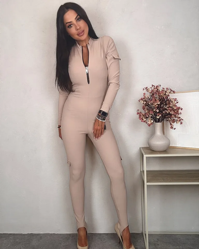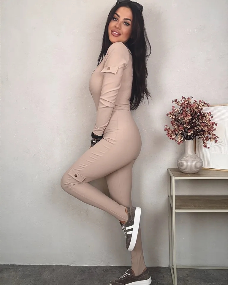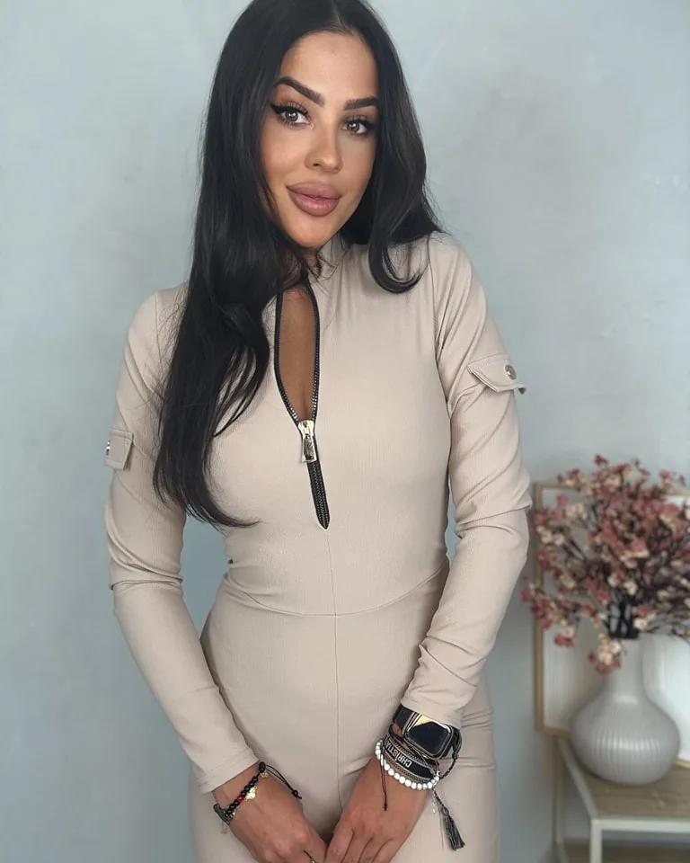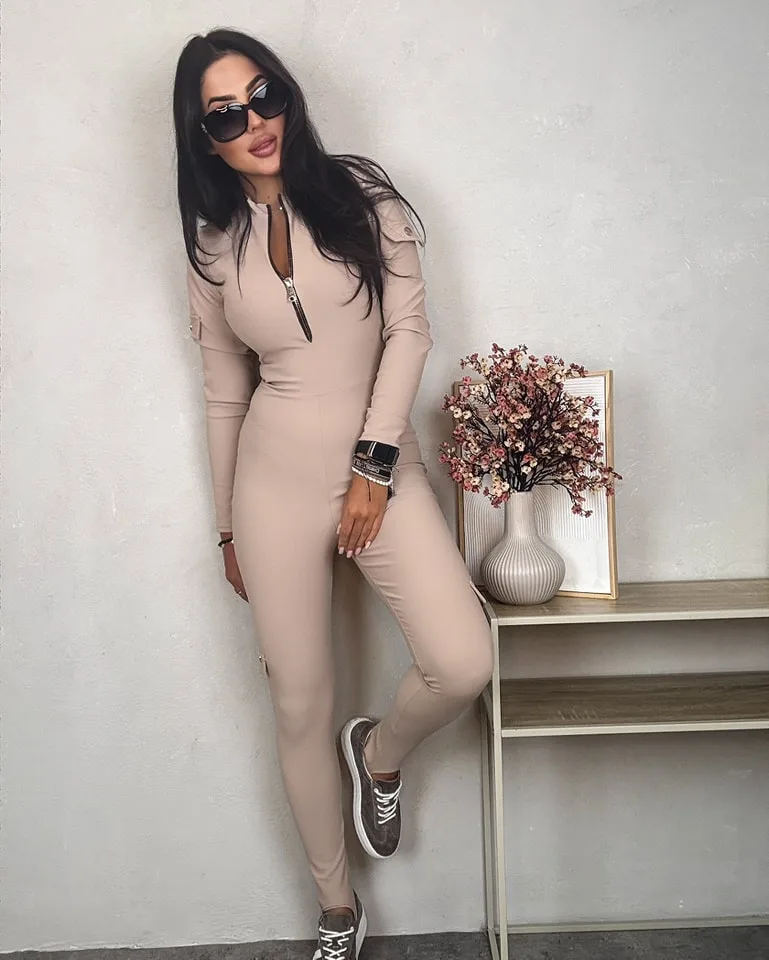 Kombinezon prążkowany beżowy z ozdobnym złotym zameczkiem na długi rękaw i długie spodnie. Ozdobne kieszonki na rękawach i nogawkach. Materiał jest rewelacyjny i ze świetnym składem (95% wiskoza i 5% elastanu)! Prążek pięknie modeluje sylwetkę i podkreśla kobiece kształty. Suwaczkiem można regulować dekolt.