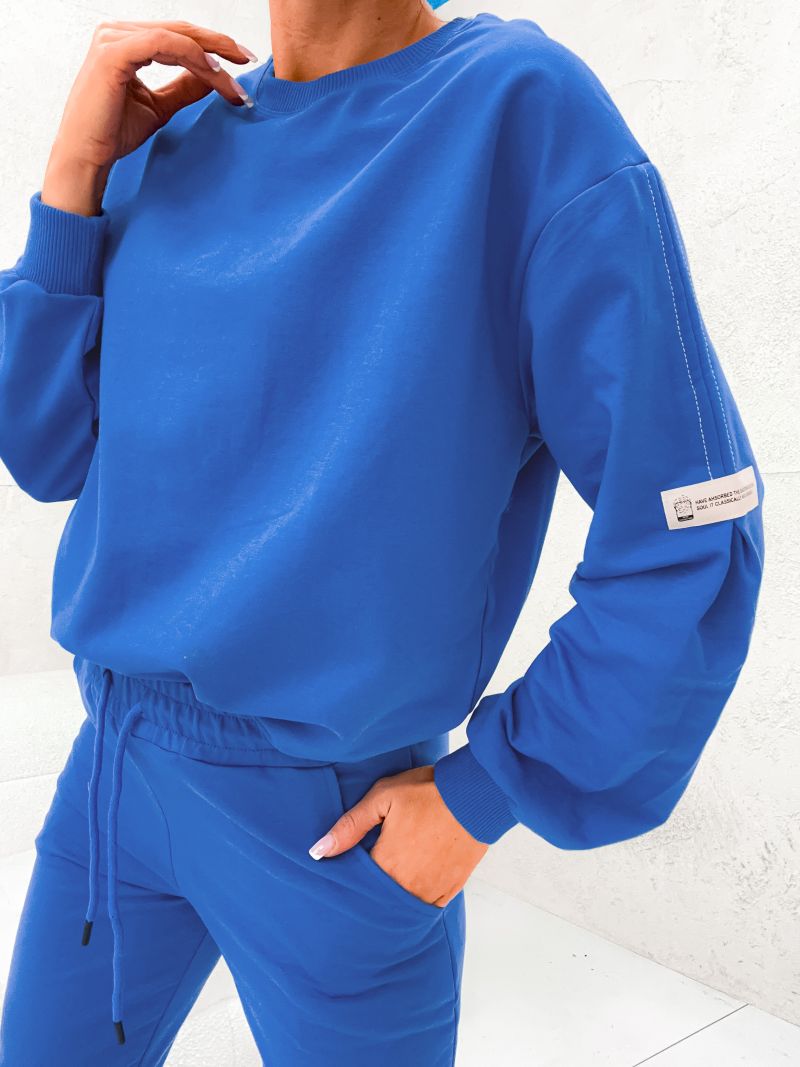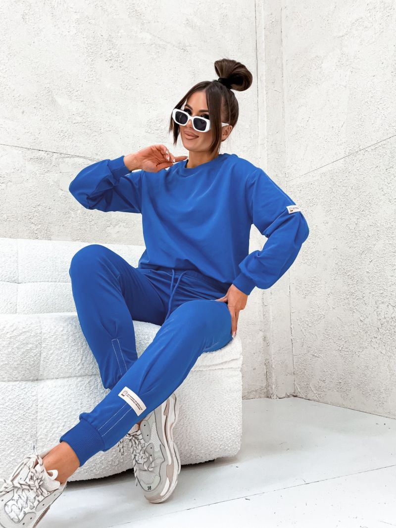 Komplet dresowy bawełniany niebieski składający się z bluzy z okrągłym dekoltem, bez kaptura oraz dresowych spodni na gumkę. Komplet dresowy bawełniany niebieski posiada na bluzie oraz spodniach ozdobne naszywki oraz przeszycia. Ten model dresu to idealny wybór dla kobiet ceniących sobie elegancję oraz wygodę. Komplet TRENDY dostępny jest w bogatej palecie kolorystycznej. Dres wykonany jest z „dresówki” diagonal.