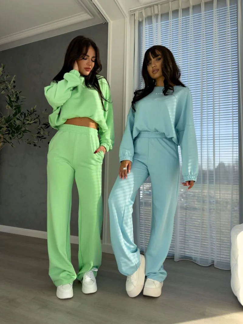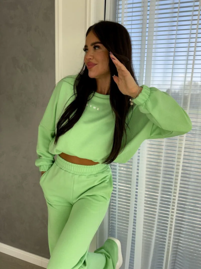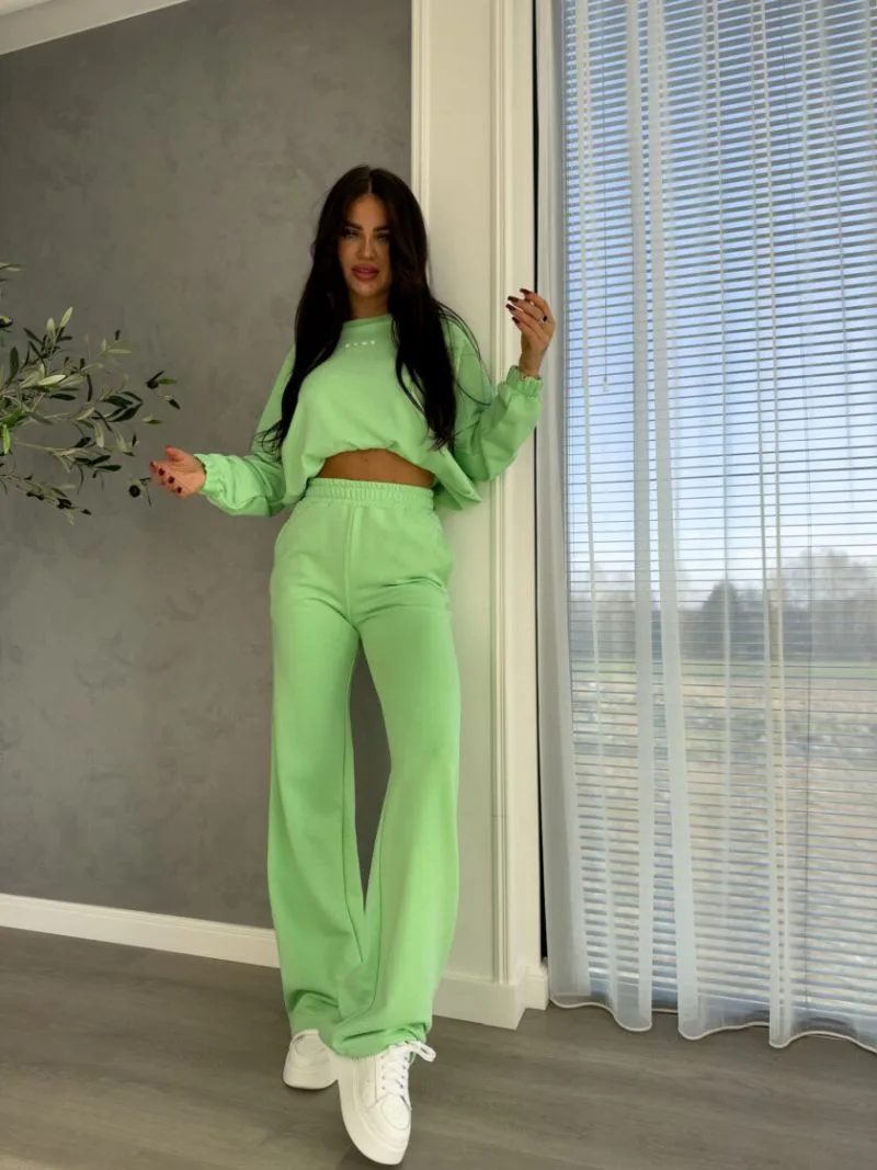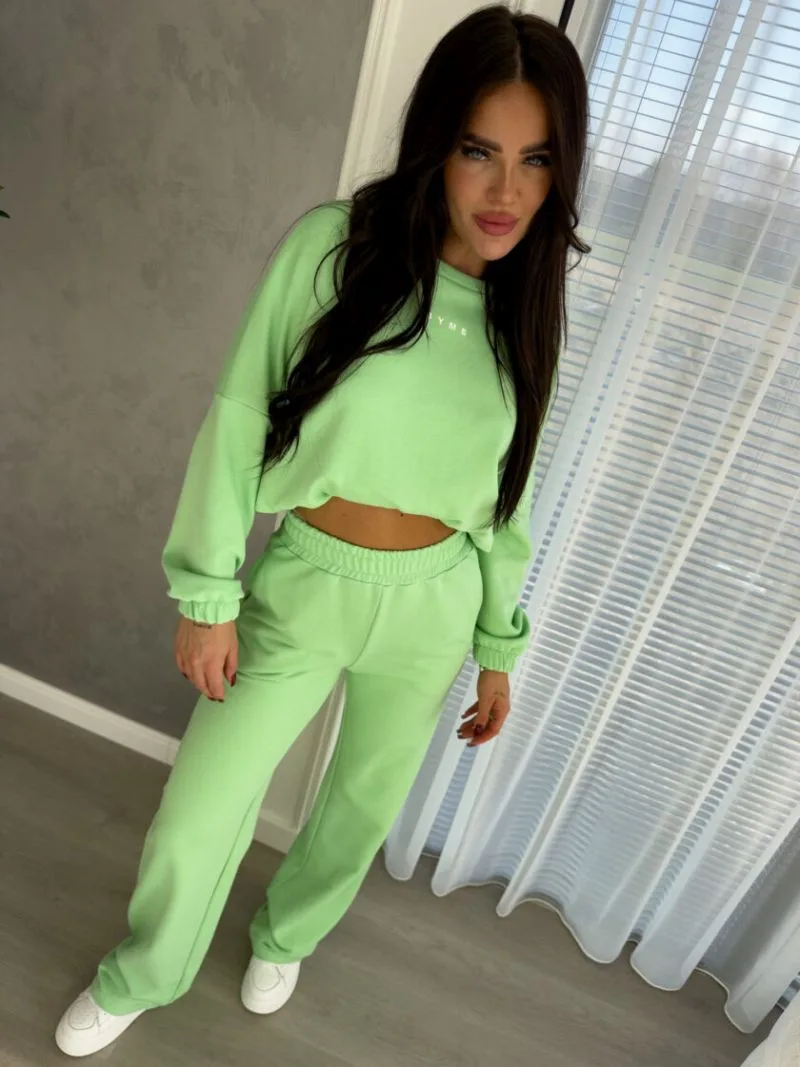 Komplet dresowy seledynowy Sydney składający się z bluzy o prostym, luźnym kroju, z długim rękawem zakończonym gumką oraz wygodnych, szerokich spodni dresowych z gumką w pasie. i spodni. Komplet dresowy seledynowy Sydney został uszyty w Polsce z wysokiej jakości bawełny.