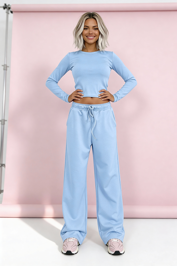HIT wśród casualowych stylizacji! Minimalistyczny komplet dresowy masełkowy niebieski z wiskozą– idealne połączenie wygody, luzu i kobiecego stylu.