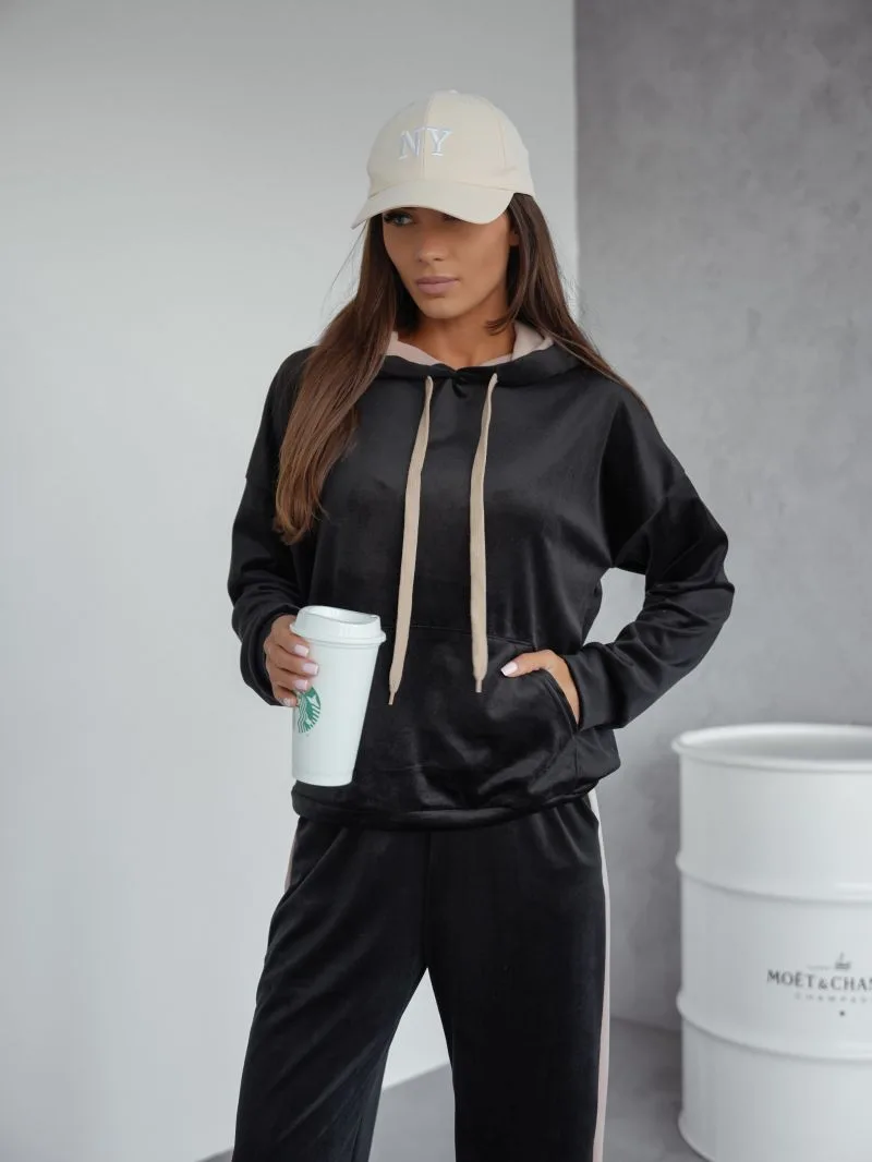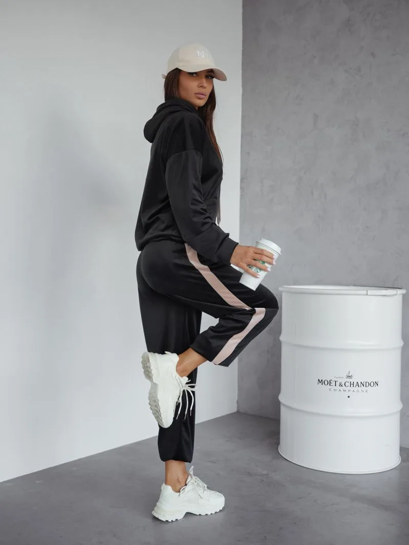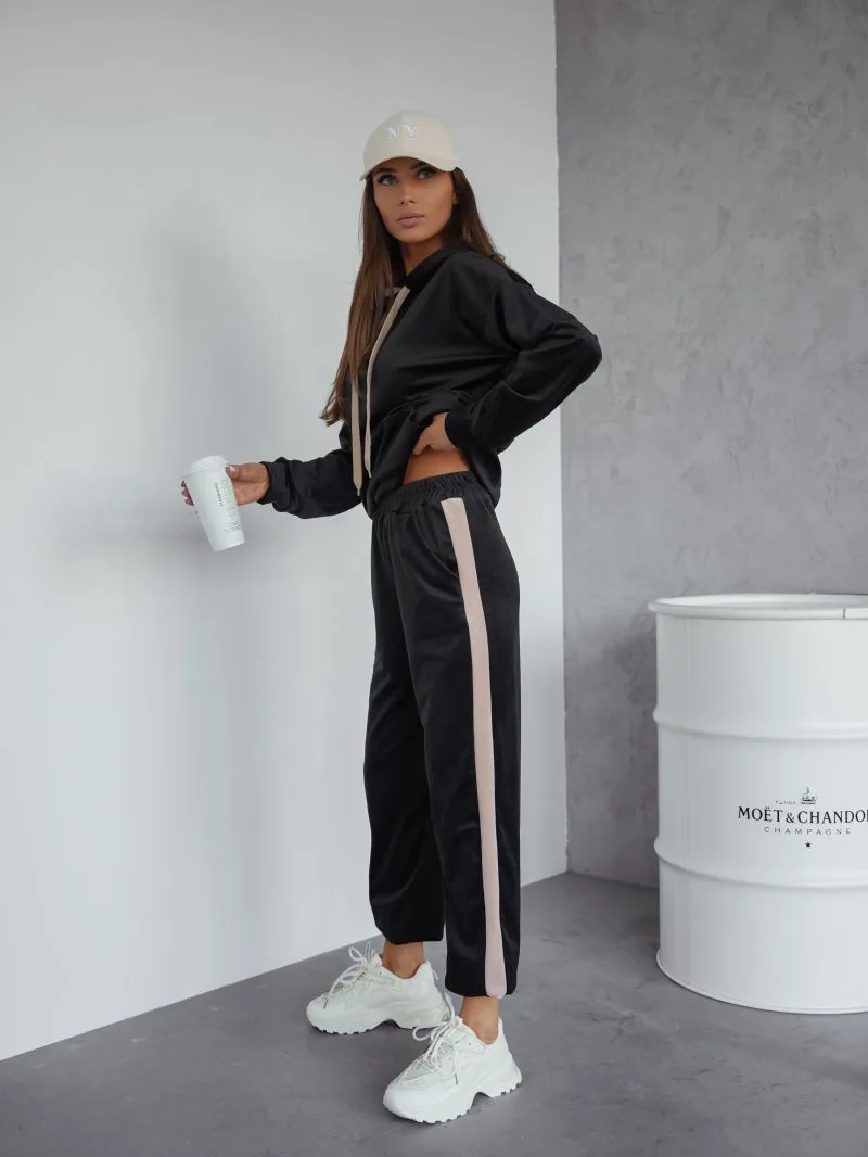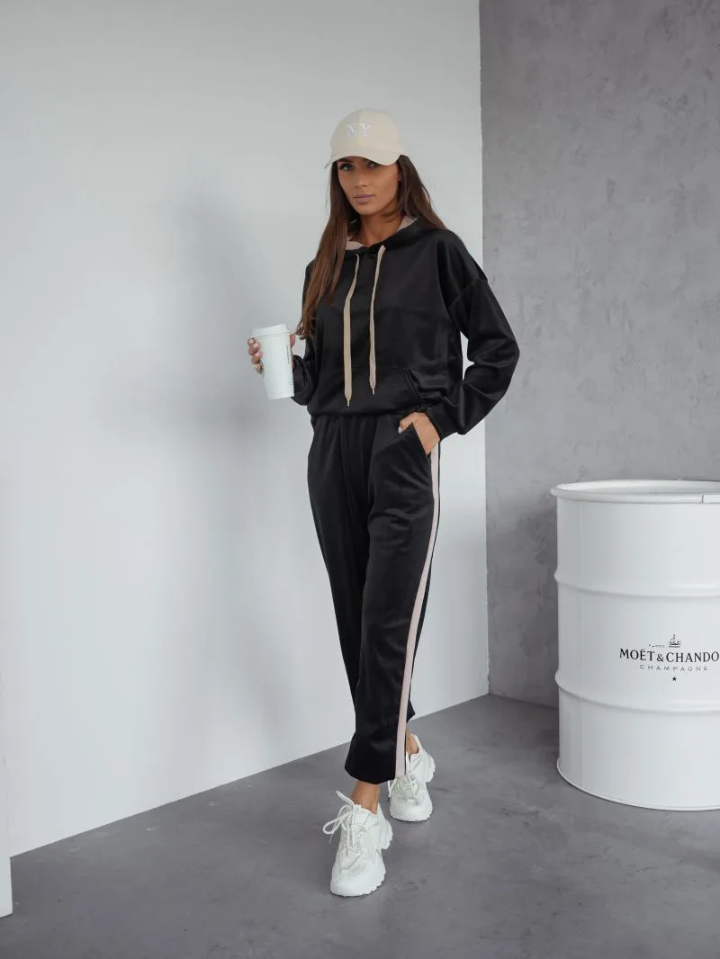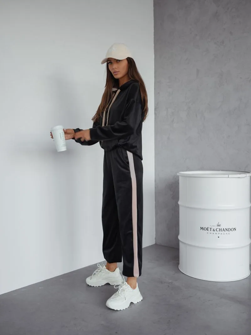 Komplet dresowy welurowy czarny z lampasami Velvet Fit został uszyty w Polsce.