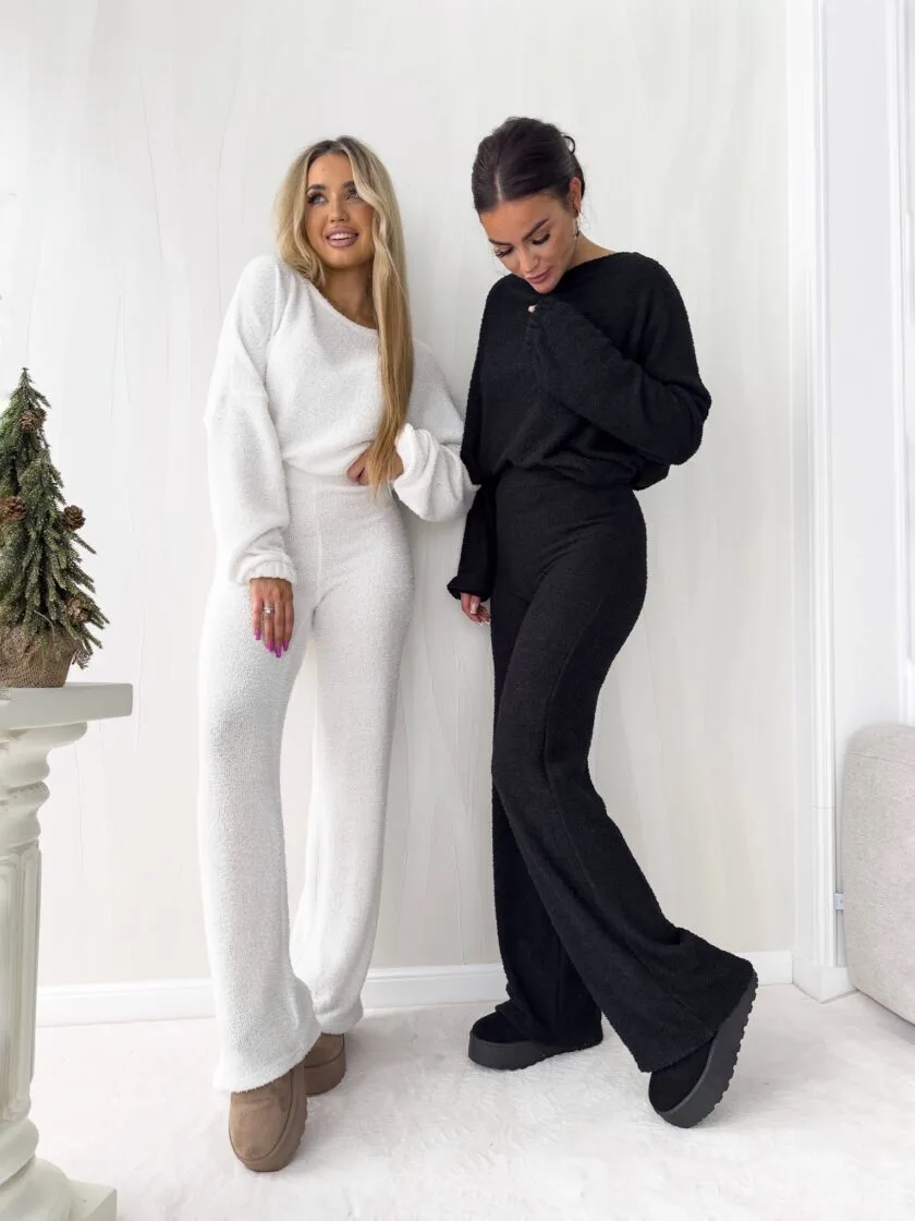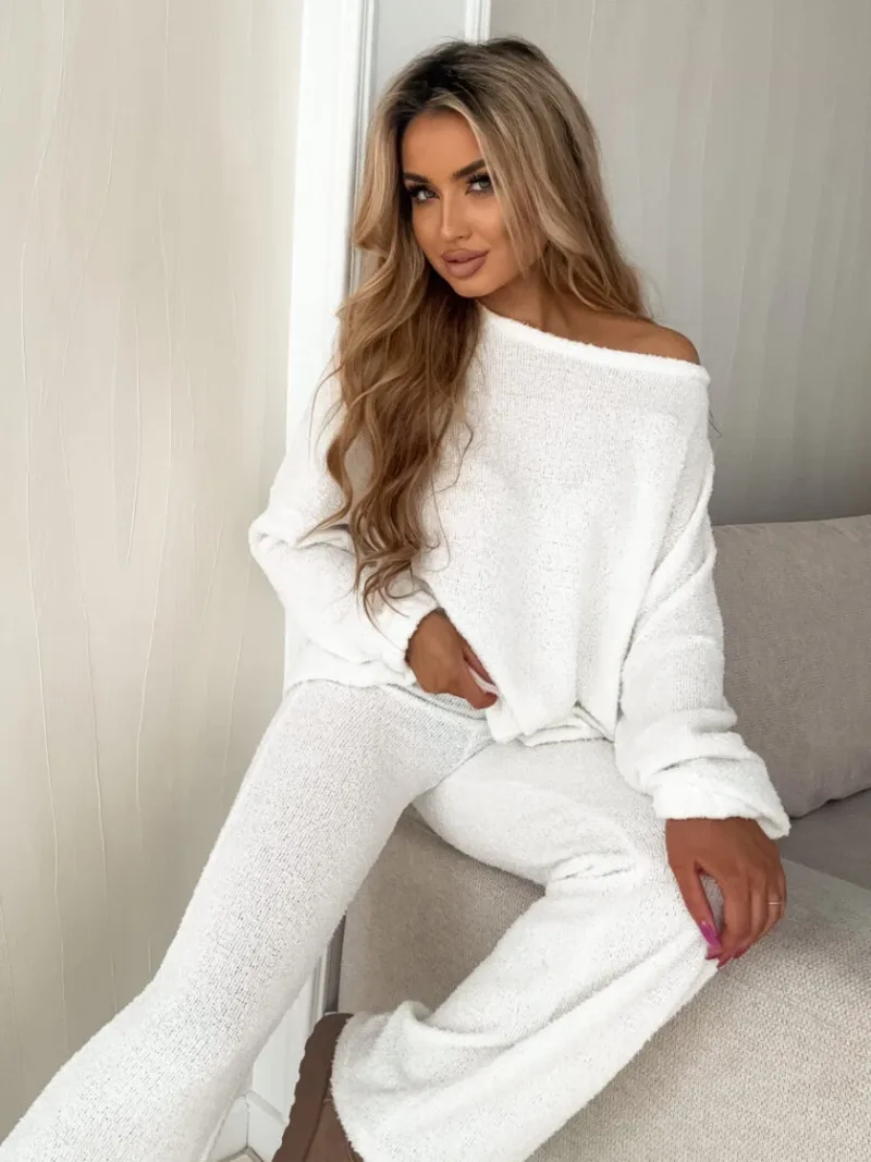Komplet dzianinowy ANGEL ecru wykonany z bardzo milutkiego materiału. Bluza o prostym, luźnym kroju, z długim rękawem zakończonym gumą. Szerokie spodnie z gumką w pasie.