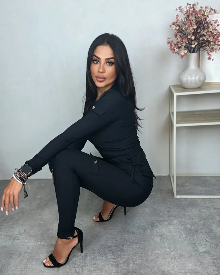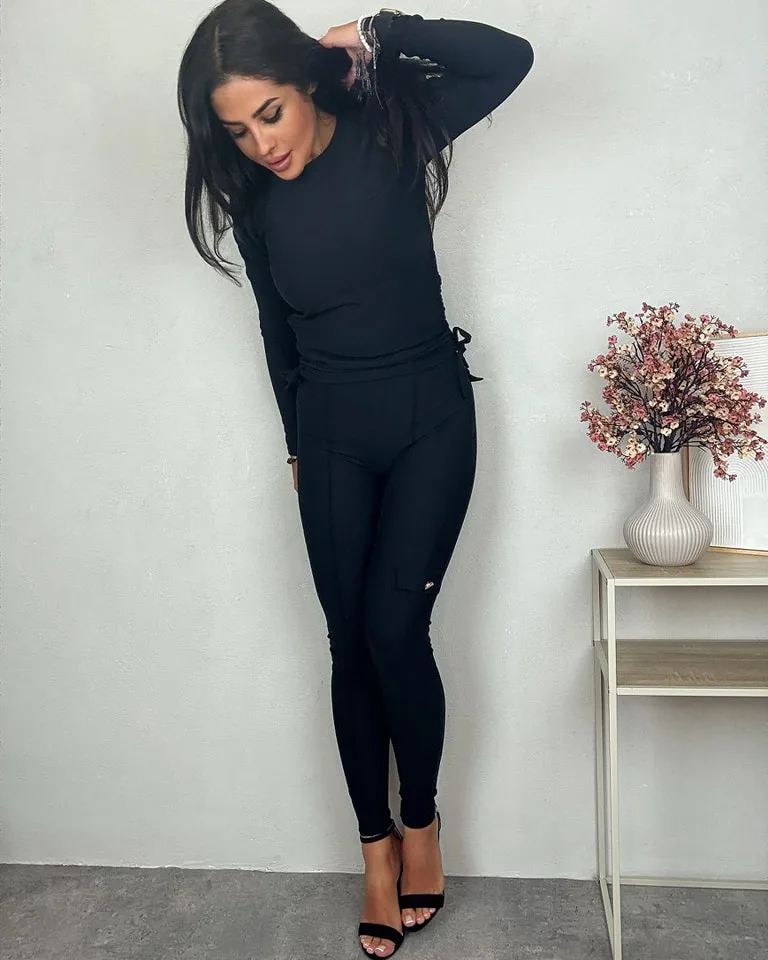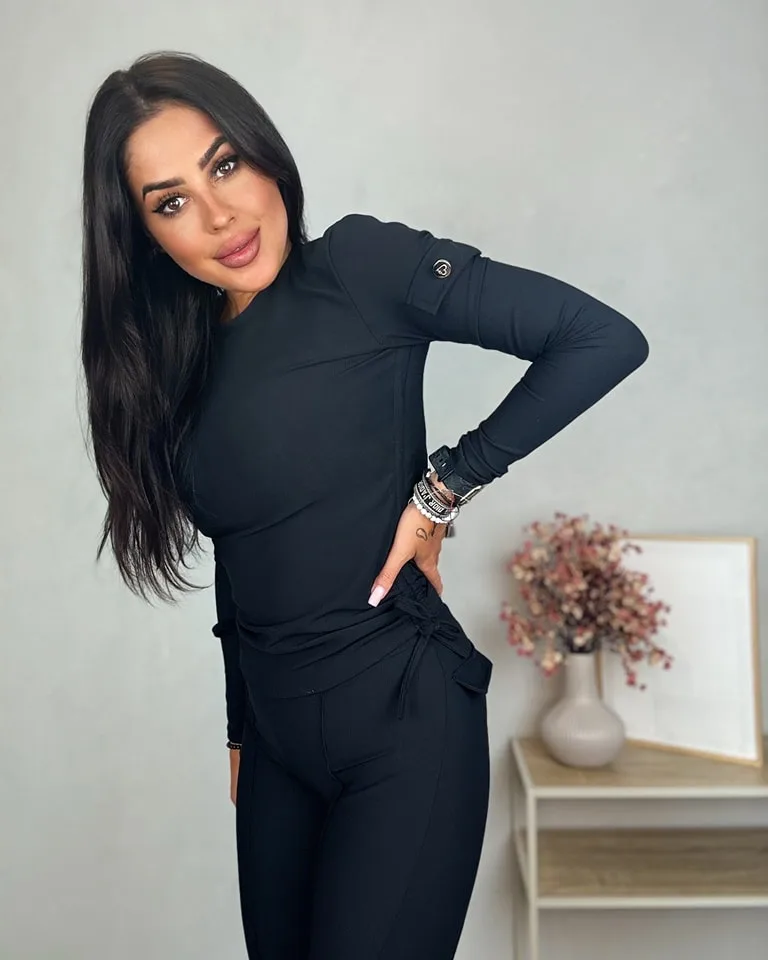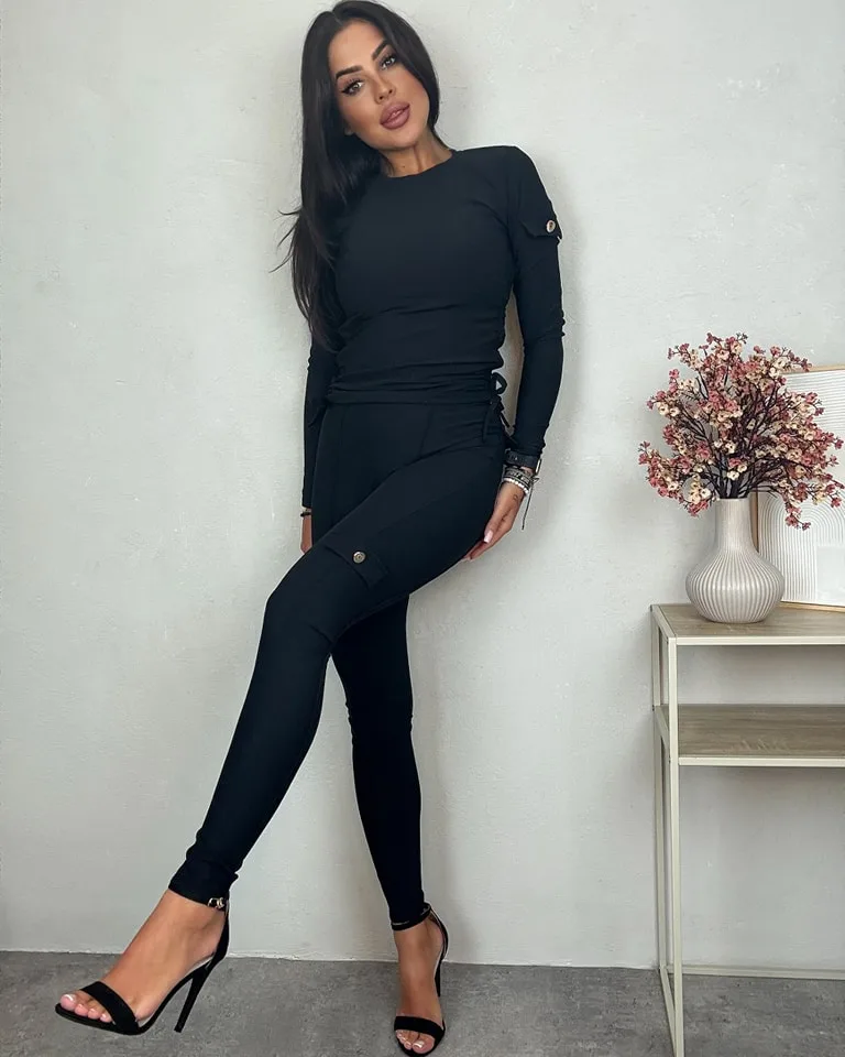 Komplet prążkowany czarny Military składający się ze spodni legginsów z kieszonkami oraz bluzki z możliwością regulacji długości. Bluzka na długi rękaw posiada kieszonki i sznureczki po bokach regulujące długość. Zarówno top, jaki i legginsy sprawdzą się w zestawie oraz osobno. Materiał, z którego są uszyte elementu kompletu to prążkowana wiskoza z dodatkiem elastanu, dzięki czemu czujemy się w nim bardzo komfortowo. Krój natomiast podkreśla figurę i przyciąga wzrok.