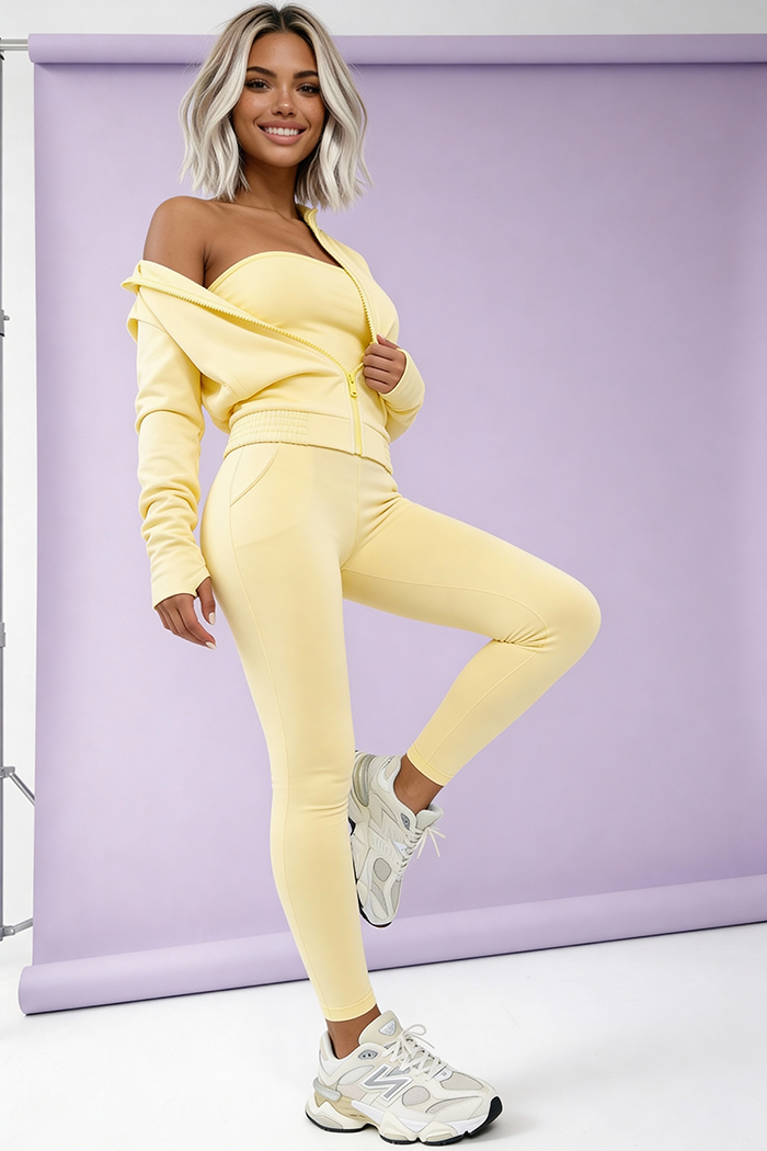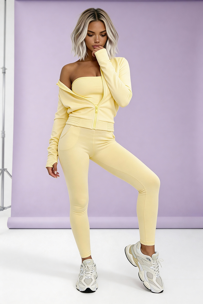Komplet składa się z trzech części: bluzy, topu i legginsów, dzięki czemu możesz nosić go na wiele sposobów: