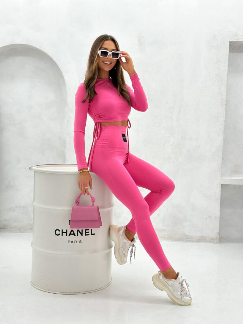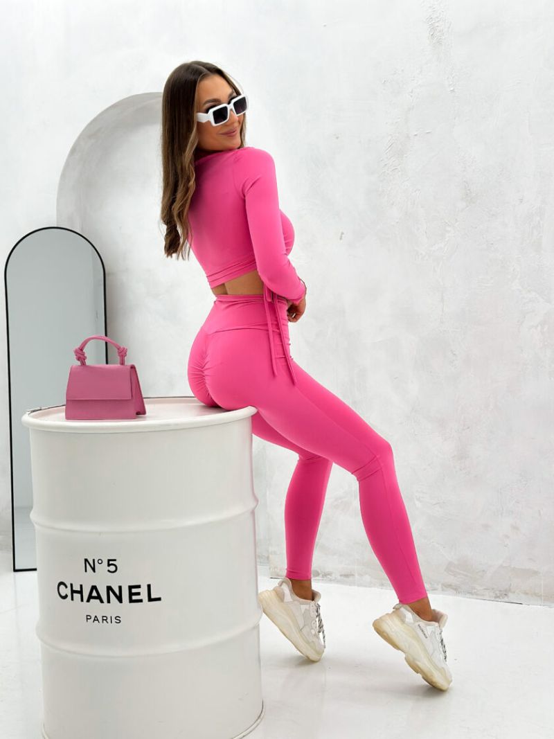 Komplet z legginsami różowy Cuttie wykonany z elastycznej, dopasowującej się do sylwetki Lycry. W skład kompletu wchodzą legginsy z wysokim stanem z logo marki Besquar oraz bluzka z długim rękawem z regulacją długości. Komplet z legginsami różowy Cuttie dostępny jest w rozmiarze uniwersalnym,  ze względu na elastyczną tkaninę będzie dobry na rozmiary od XS do L.