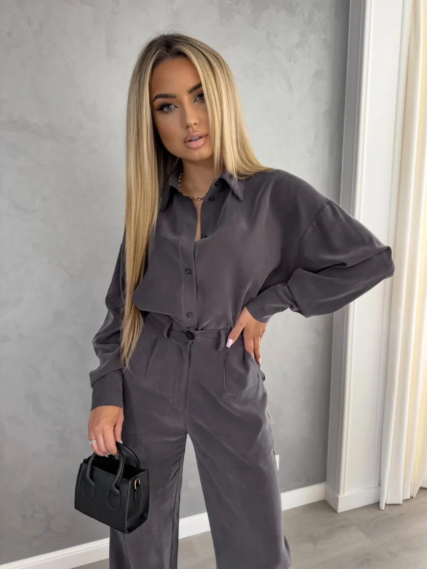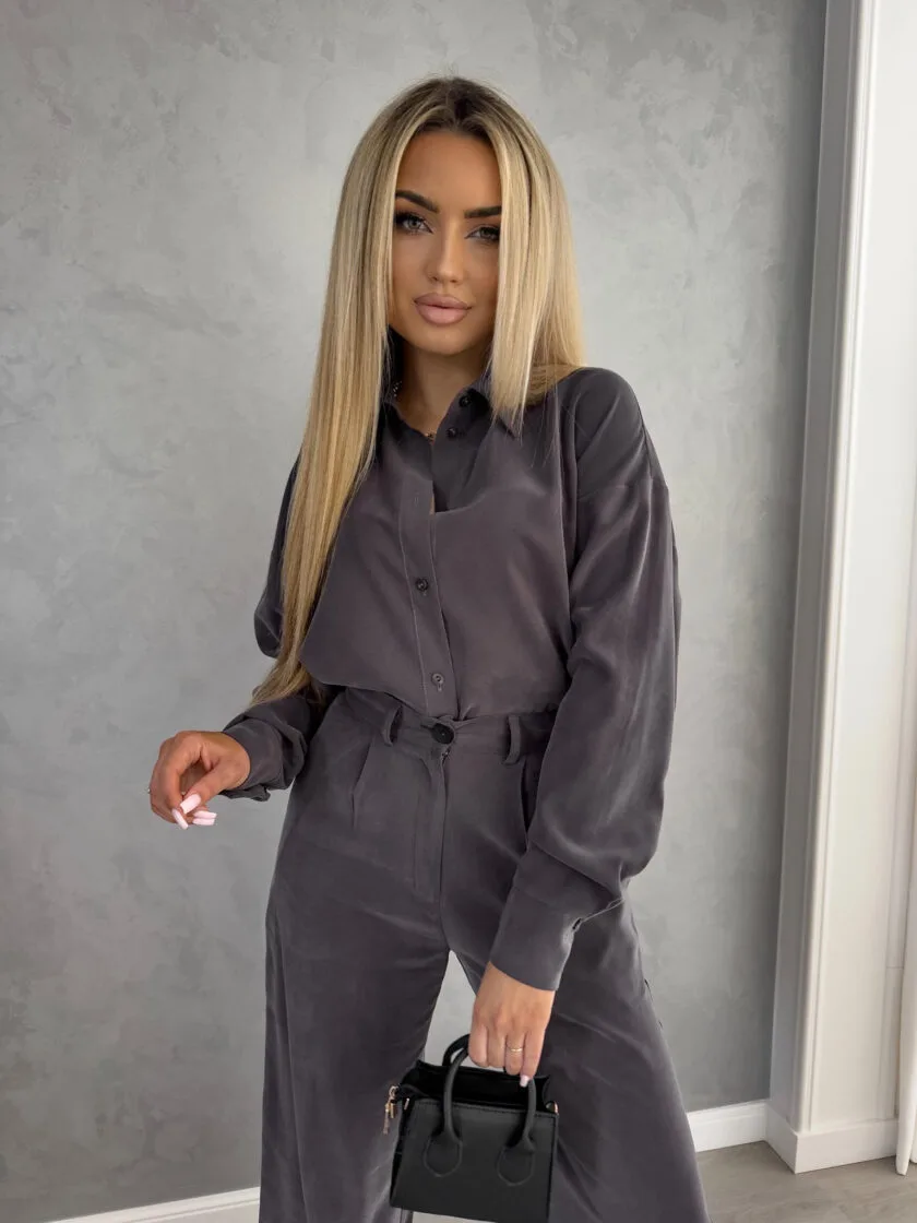 Koszula Tencel szara o luźnym kroju, zapinana na guziki.