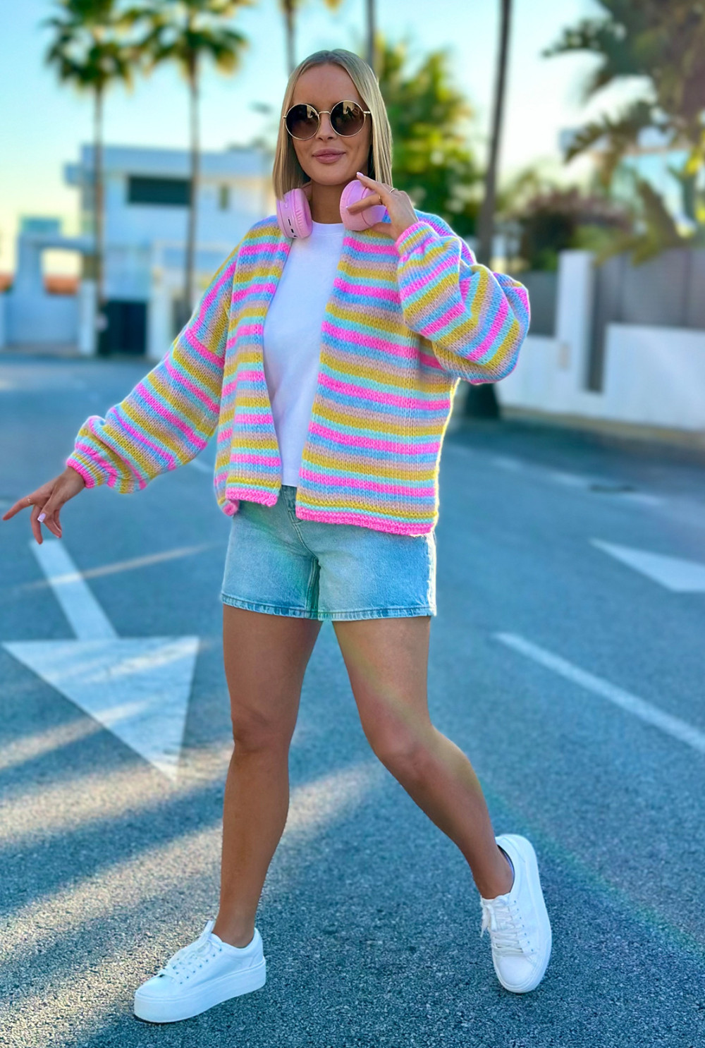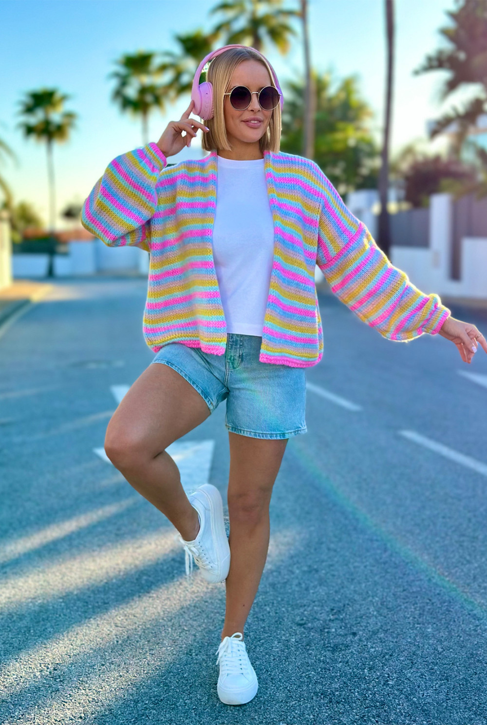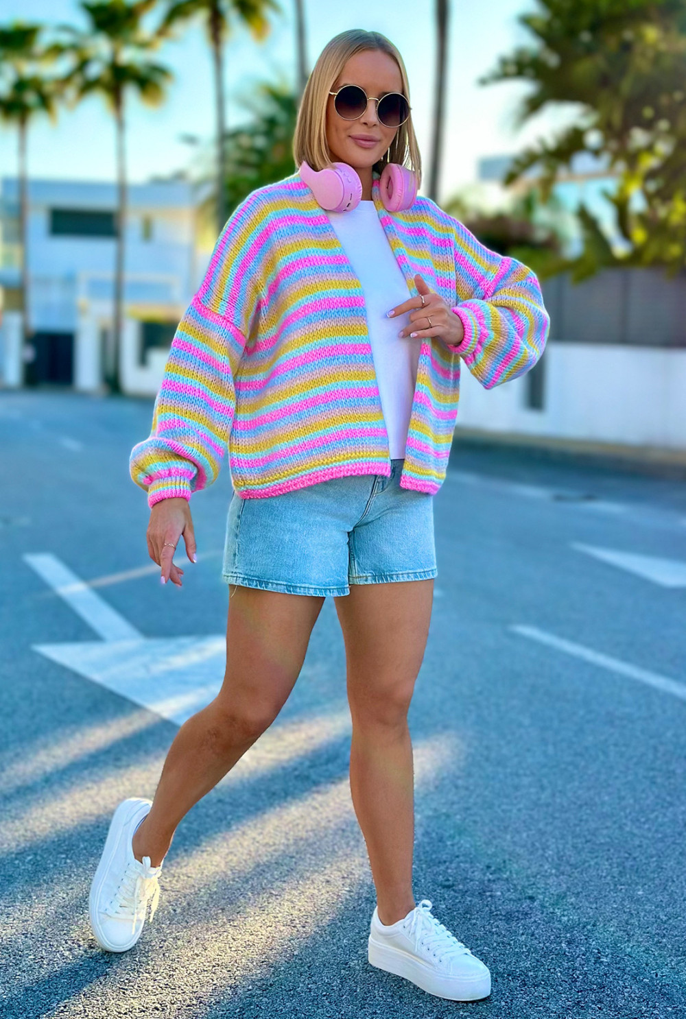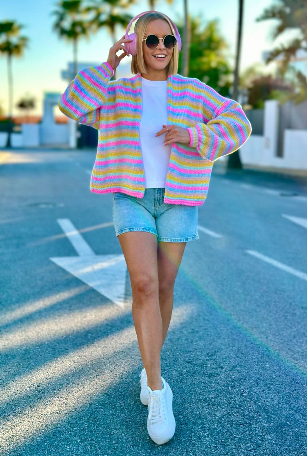Krótki kardigan w paski Pinacolada róż-turkus to lekki sweterek-narzutka o kroju oversize to propozycja, która świetnie dopełni każdą stylizację. To model o krótkim fasonie z obniżoną linią ramion, nie posiada zapięcia. Dostępny w wielu wersjach kolorystycznych.
