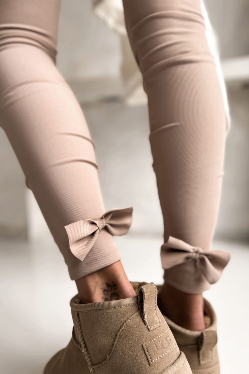 Legginsy beżowe Shape mają doszytą ozdobną kokardkę na dole nogawki.