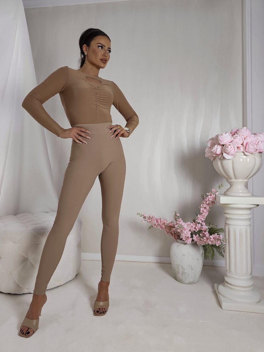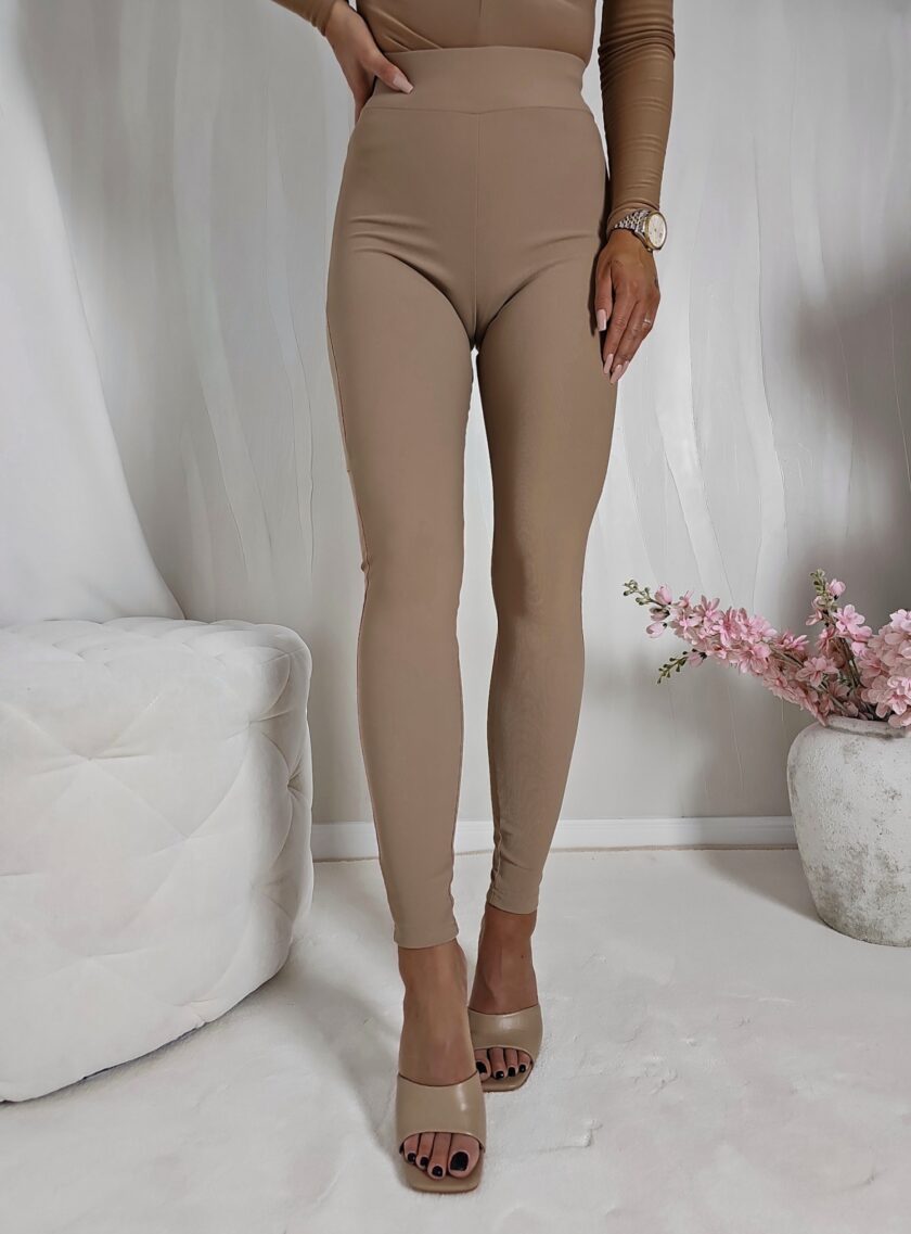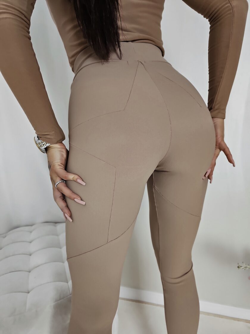 Legginsy prążkowane beżowe Star wykonane z ciągliwego materiału. Widoczny prążek na materiale. Gumka w pasie, a z tyłu efektowne cięcia, które tworzą wzór gwiazdy.