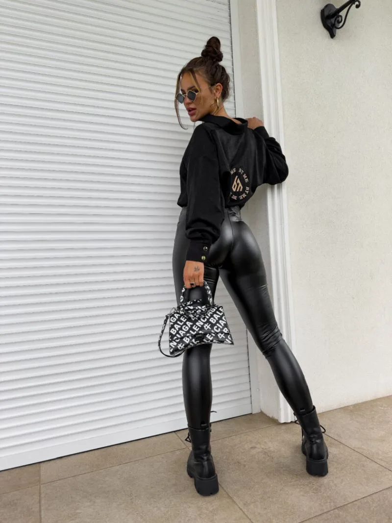 Legginsy skórzane czarne lekko ocieplane meszkiem. Spodnie mają gumkę w pasie i ozdobne zameczki na nogawkach. Skórzane wykończenie sprawia, że pasują do wielu stylizacji, również tych eleganckich. Legginsy skórzane czarne zostały wyprodukowane w Polsce: By Me.