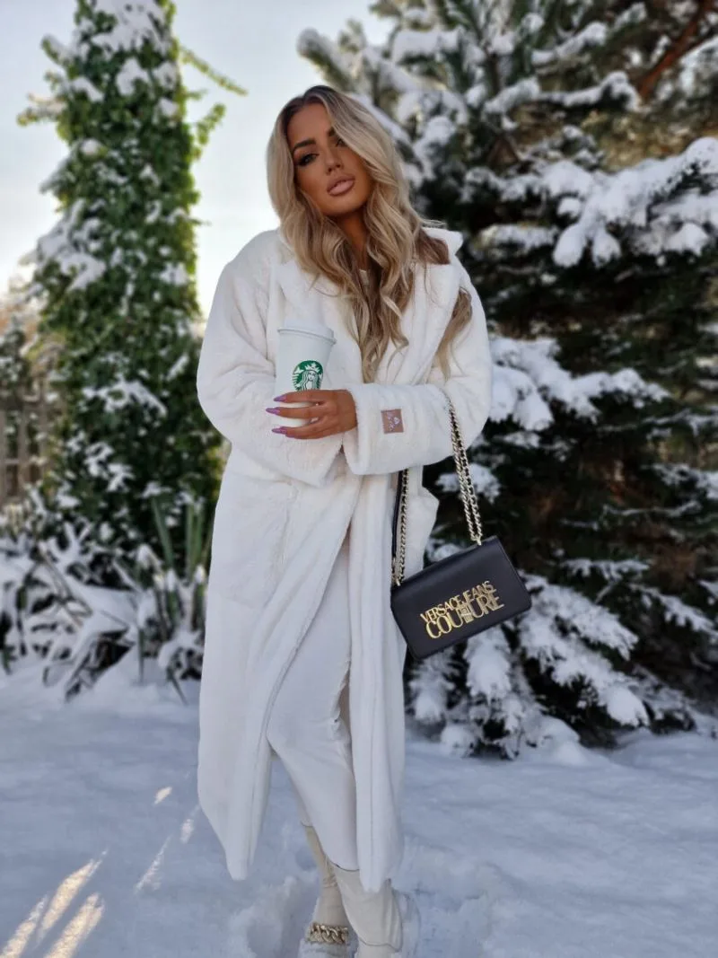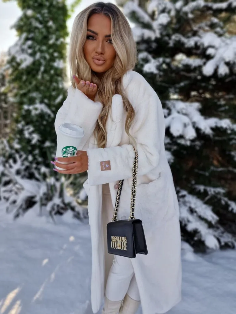 Płaszcz ecru Noelle to ciepły, zimowy płaszcz z „misia” z kieszeniami i kołnierzem. Logo marki By Me Anita na lewym rękawie. Płaszcz ecru Noelle zapinany jest na guziki, długość za kolana (115-116 cm w zależności od rozmiaru).