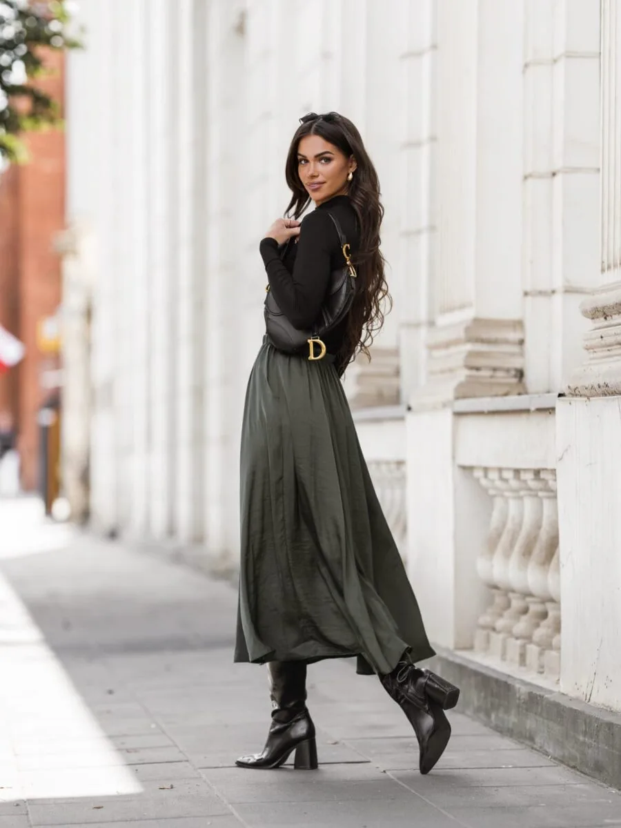 Spódnica maxi khaki Elene to lekka, zwiewna spódnica uszyta z satyny kreszowanej.