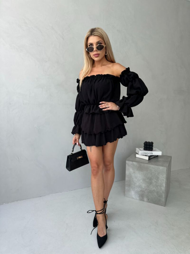 Spódnica mini z falbankami Lala o asymetrycznym kroju z krótszymi bokami, posiada dwie falbanki i elastyczna gumę w pasie. Do spódniczki można dokupić Hiszpankę LALA tworząc komplet.