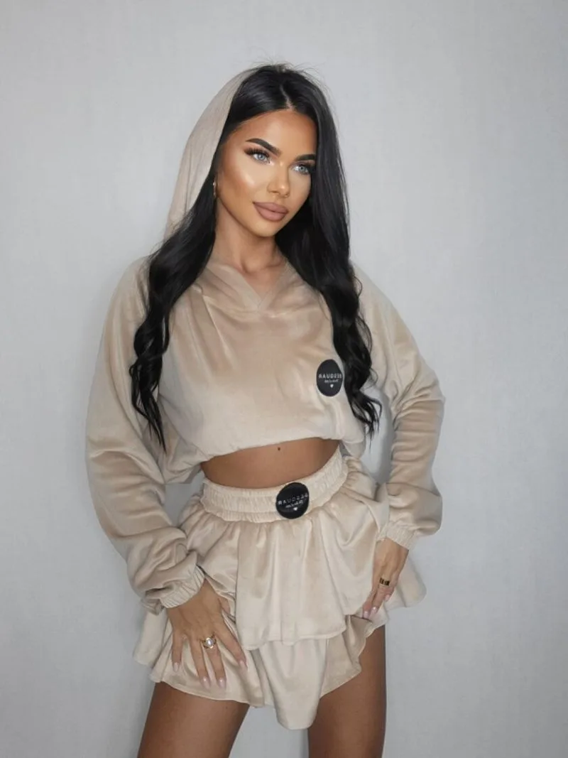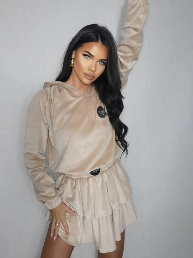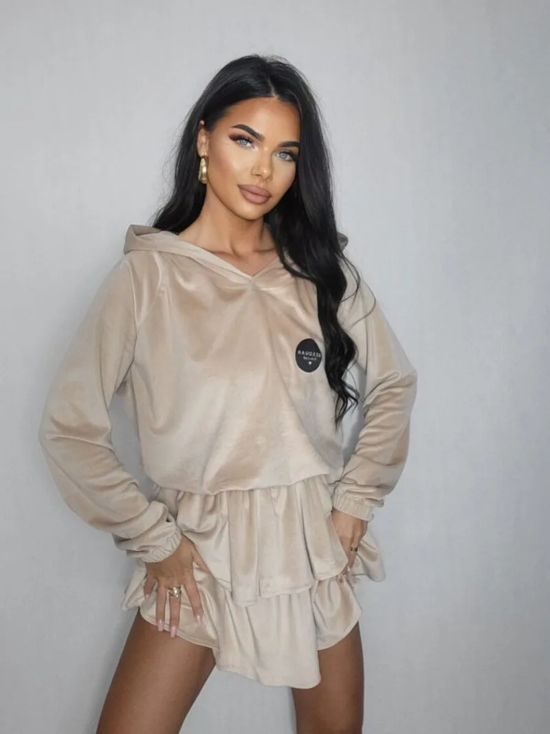 Spódniczka welurowa beżowa NOISE to spódniczka o asymetrycznym kroju z krótszymi bokami, posiadająca dwie falbanki i elastyczna gumę w pasie