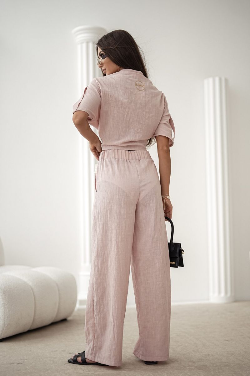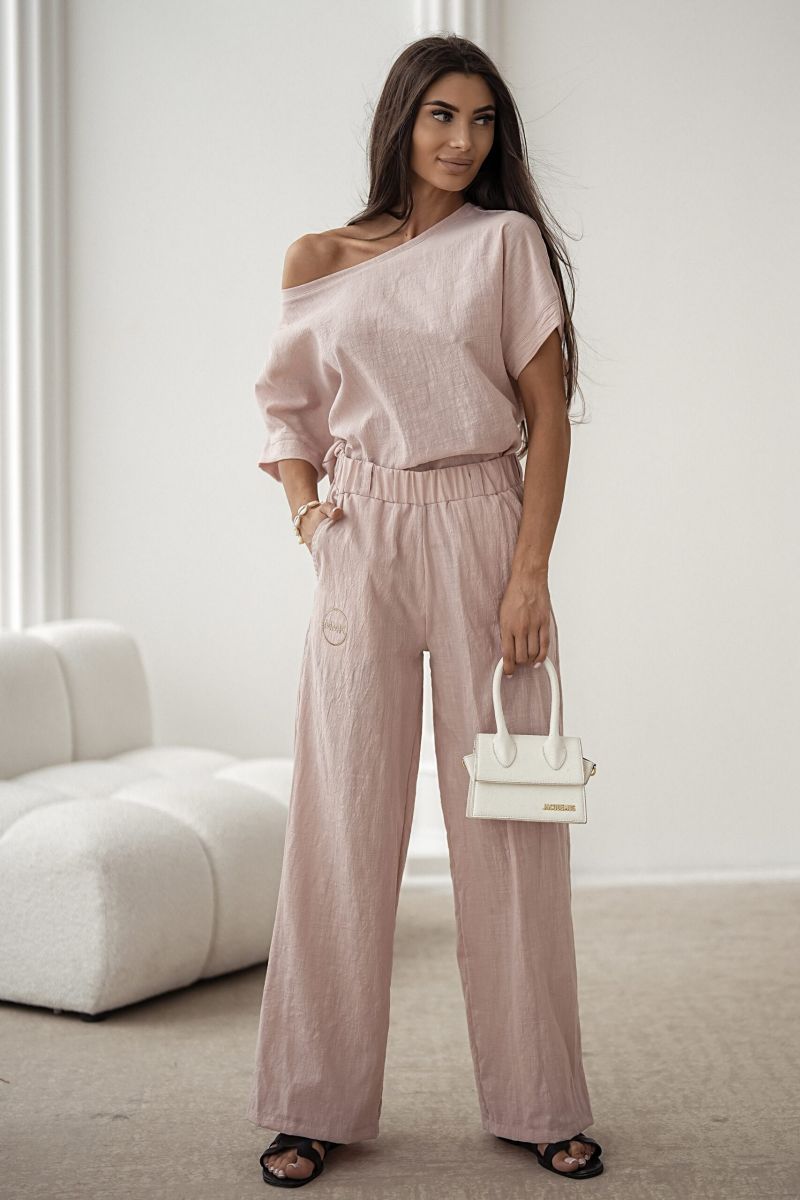 Spodnie lniane pudrowy róż z długimi nogawkami wykonane z przewiewnego materiału, idealnego na letnie dni. Spodnie lniane pudrowy róż posiadają wygodną gumkę w pasie. Można je zestawić z bluzką w tym samym kolorze z kolekcji Holiday tworząc piękny zestaw.