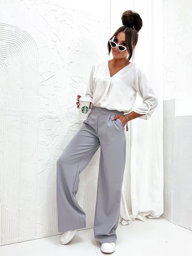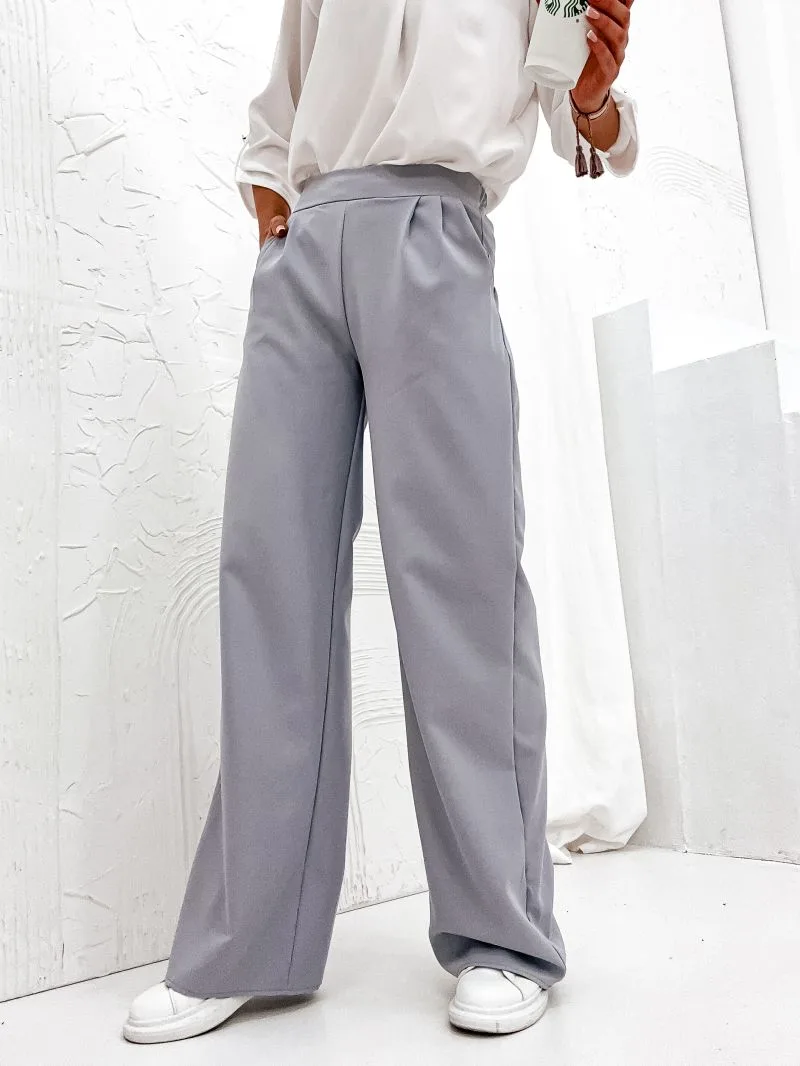 Spodnie szare materiałowe Elle to klasyczne spodnie o nieco szerszej nogawce, z gumką z tyłu w pasie. Idealnie komponują się do eleganckich stylizacji z koszulą oraz do stylizacji casulowych w połączeniu z t-shirtem. Materiał ładnie układa się na sylwetce.