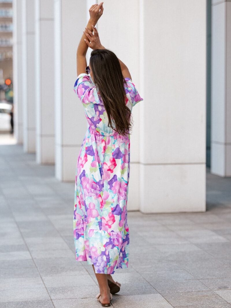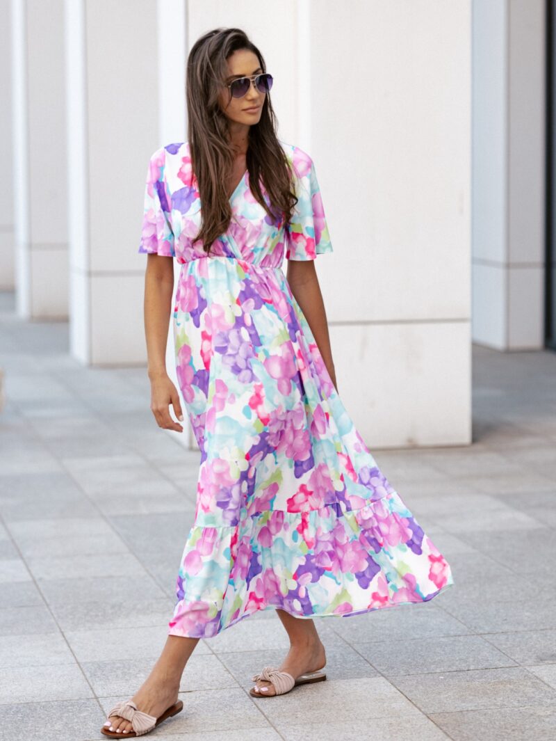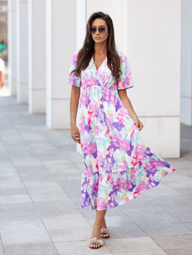 Elegancka sukienka maxi liliowa Rose w kwiatowy wzór z krótkim rękawem. Dekolt sukienki jest kopertowy, w pasie luźna gumeczka lekko podkreślająca talię. Na dole dodająca uroku i zwiewności falbanka. Sukienka maxi liliowa Rose będzie się pięknie prezentować w połączeniu ze szpilkami lub z letnimi sandałkami. Fason uniwersalny pasuje na każdą sylwetkę. Materiał bardzo przyjemny, dobrze się układa, kolory nasycone. Idealna na romantyczną kolację z ukochanym.