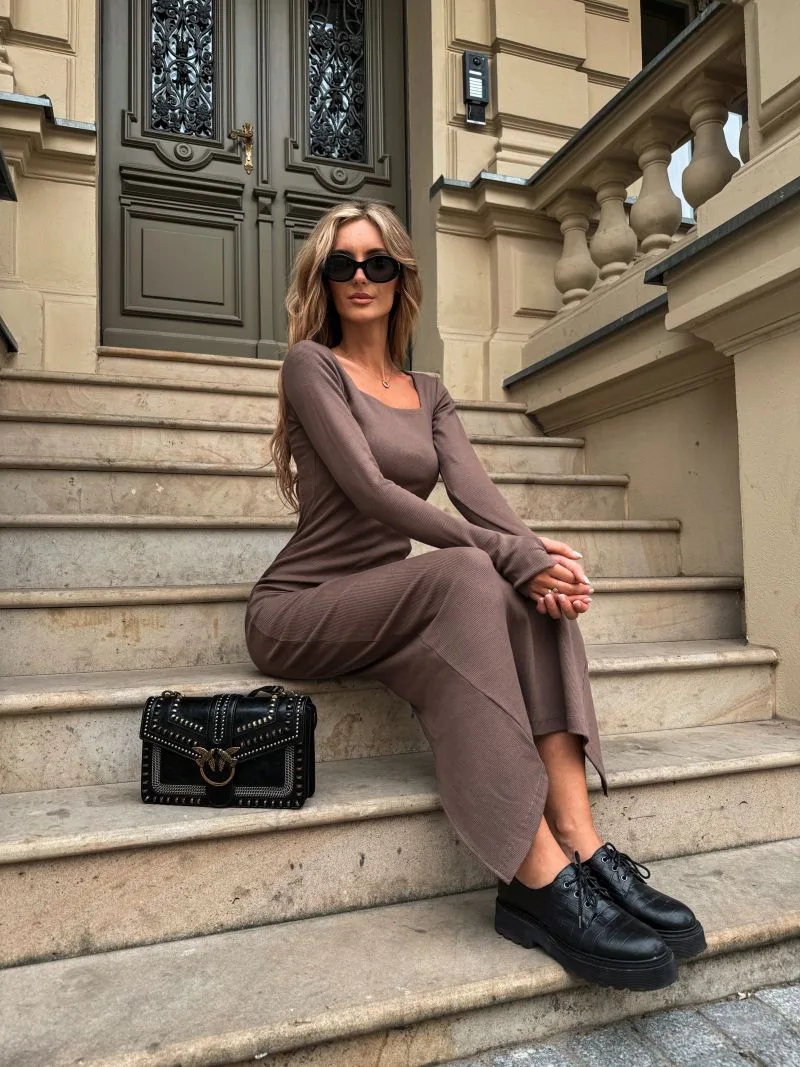 Sukienka prążkowana cappuccino uszyta z bardzo wygodnej, elastycznej bawełny to obowiązkowy punkt w każdej szafie! Jest na tyle uniwersalna, że będzie świetna do naprawdę wielu stylizacji. Na przykład w połączeniu ze sportowymi butami i kataną jeansową albo w wersji wiosenno- letniej z sandałkami, jak i również jesienią do botków. Materiał pięknie układa się na sylwetce podkreślając jej atuty, dodatkowo jest bardzo przyjemny i komfortowy w użytkowaniu. Kolor cappuccino nigdy nie wychodzi z mody. Ze względu na elastyczny materiał sukienka będzie również pasowała na ciążowy brzuszek.