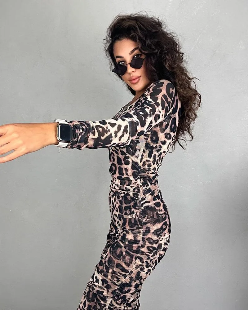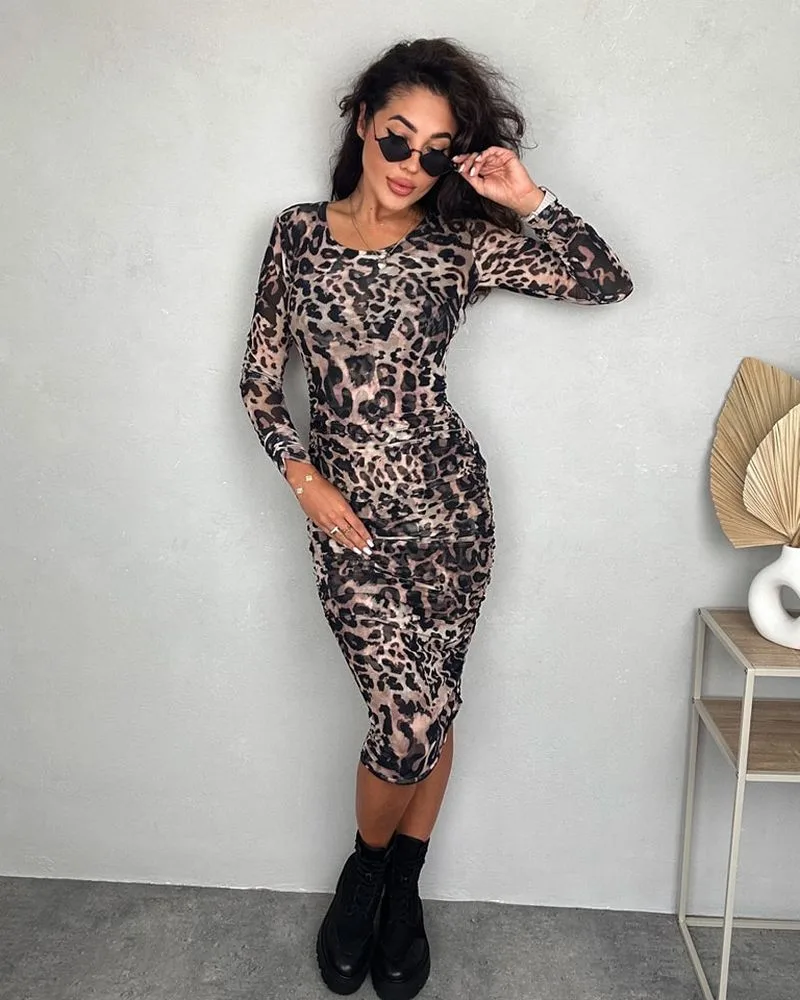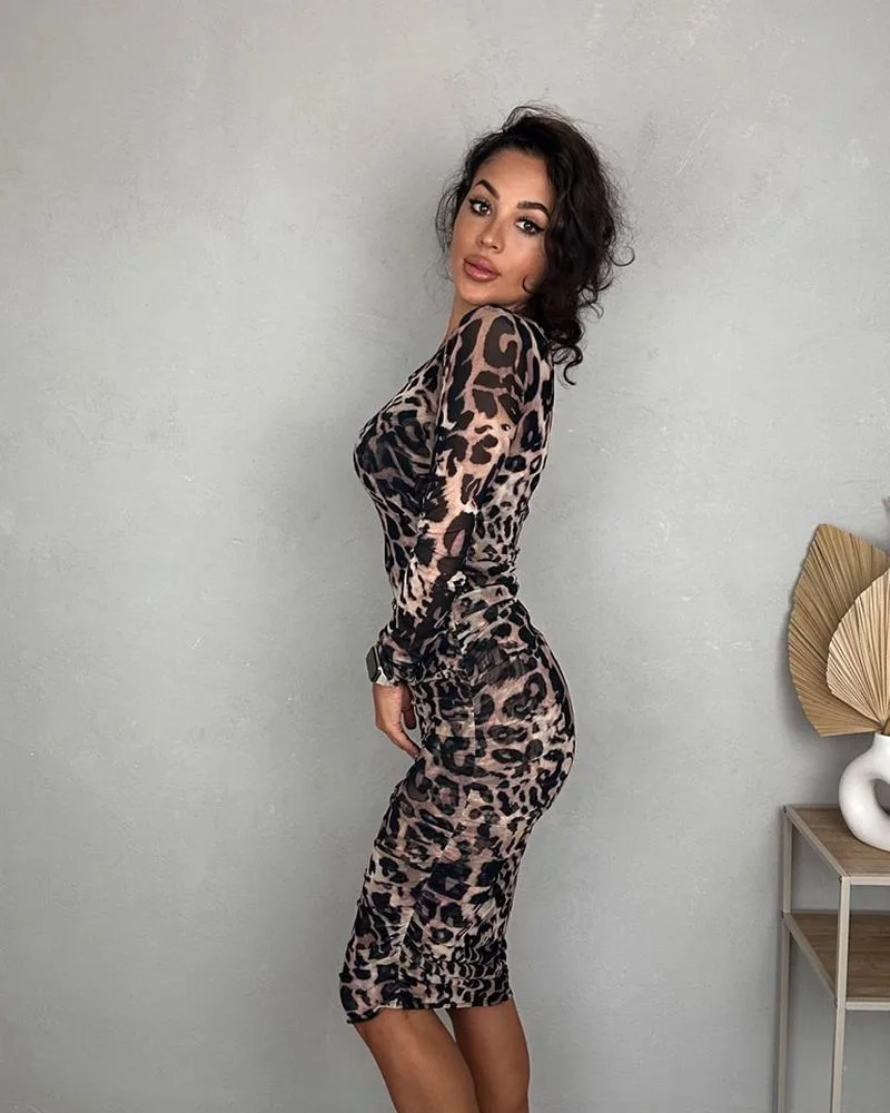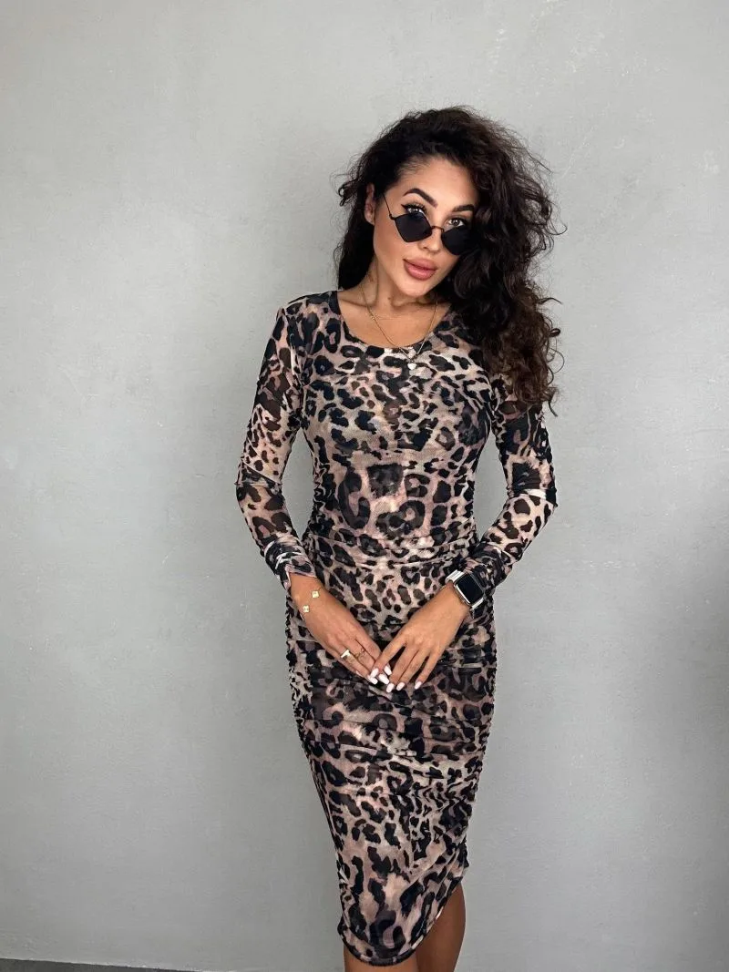 Sukienka siatka w panterkę dostępna jest w rozmiarach S, M, L.