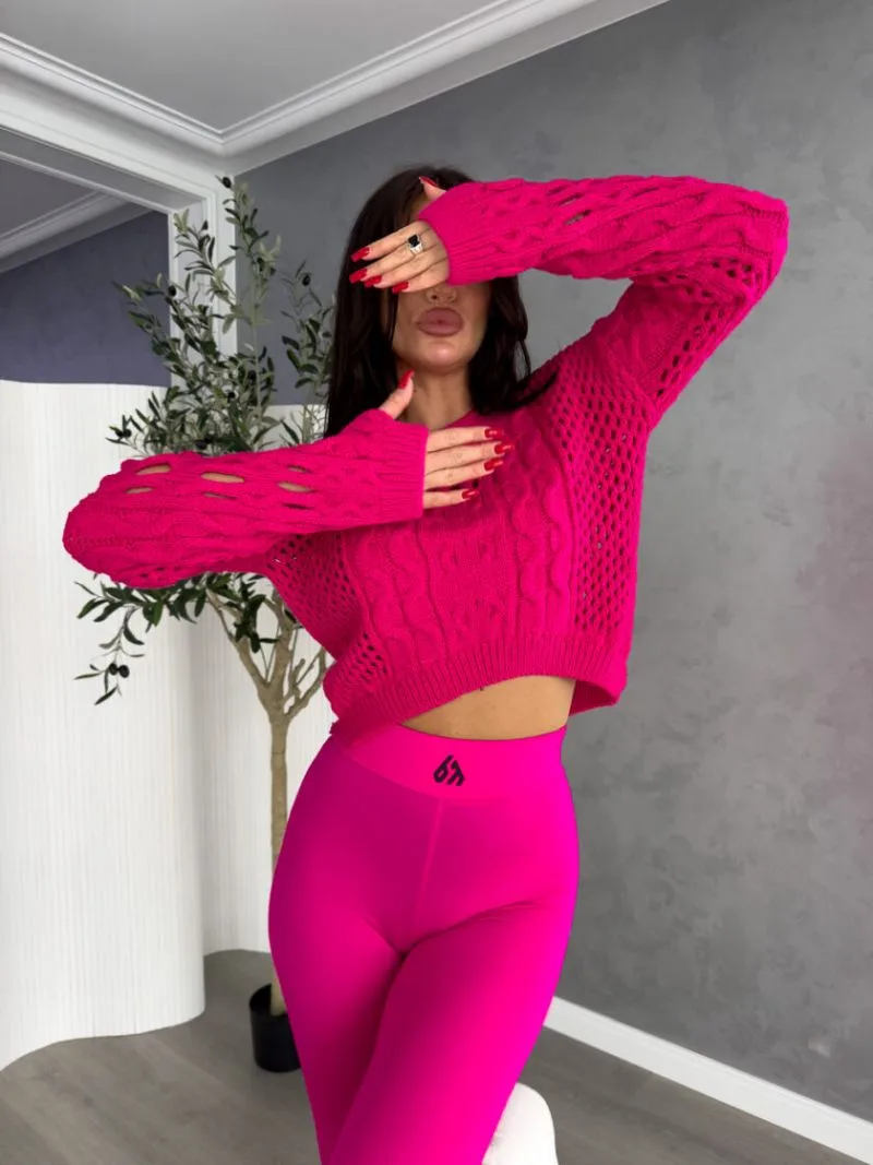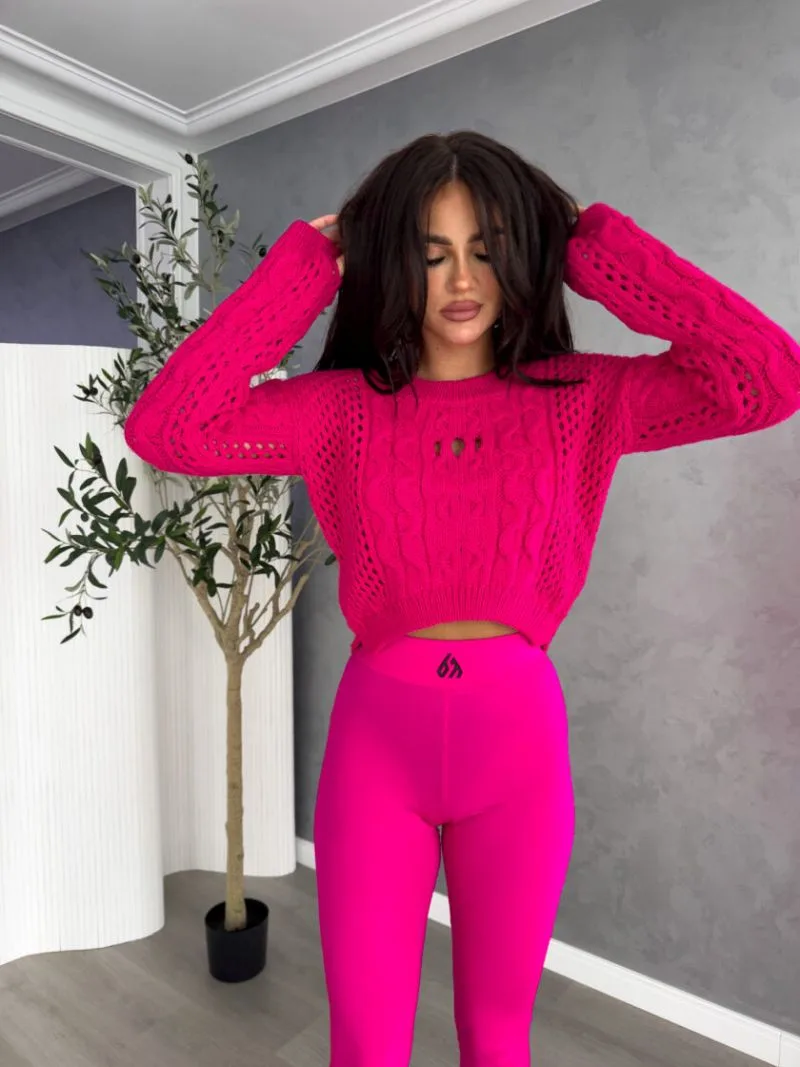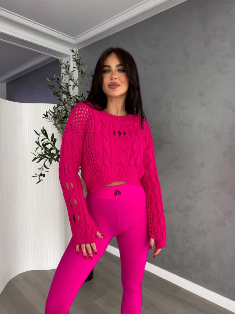 Sweter ażurowy fuksja Moon wkładany przez głowę z pięknym, ozdobnym splotem. Krój sweterka krótszy, świetnie komponuje się z jeansami z wysokim stanem lub legginsami. Użyta przędza z kaszmirem sprawia, że sweterek jest niezwykle przyjemny dla ciała i nie drapie. Modny, intensywny kolor to dodatkowy atut. Jeśli chcesz się wyróżniać z tłumu, to niewątpliwie model stworzony dla Ciebie.