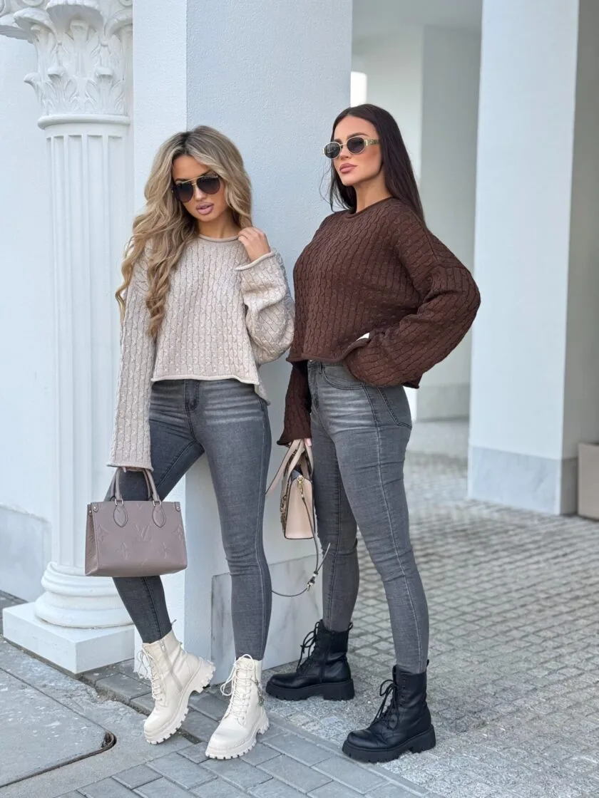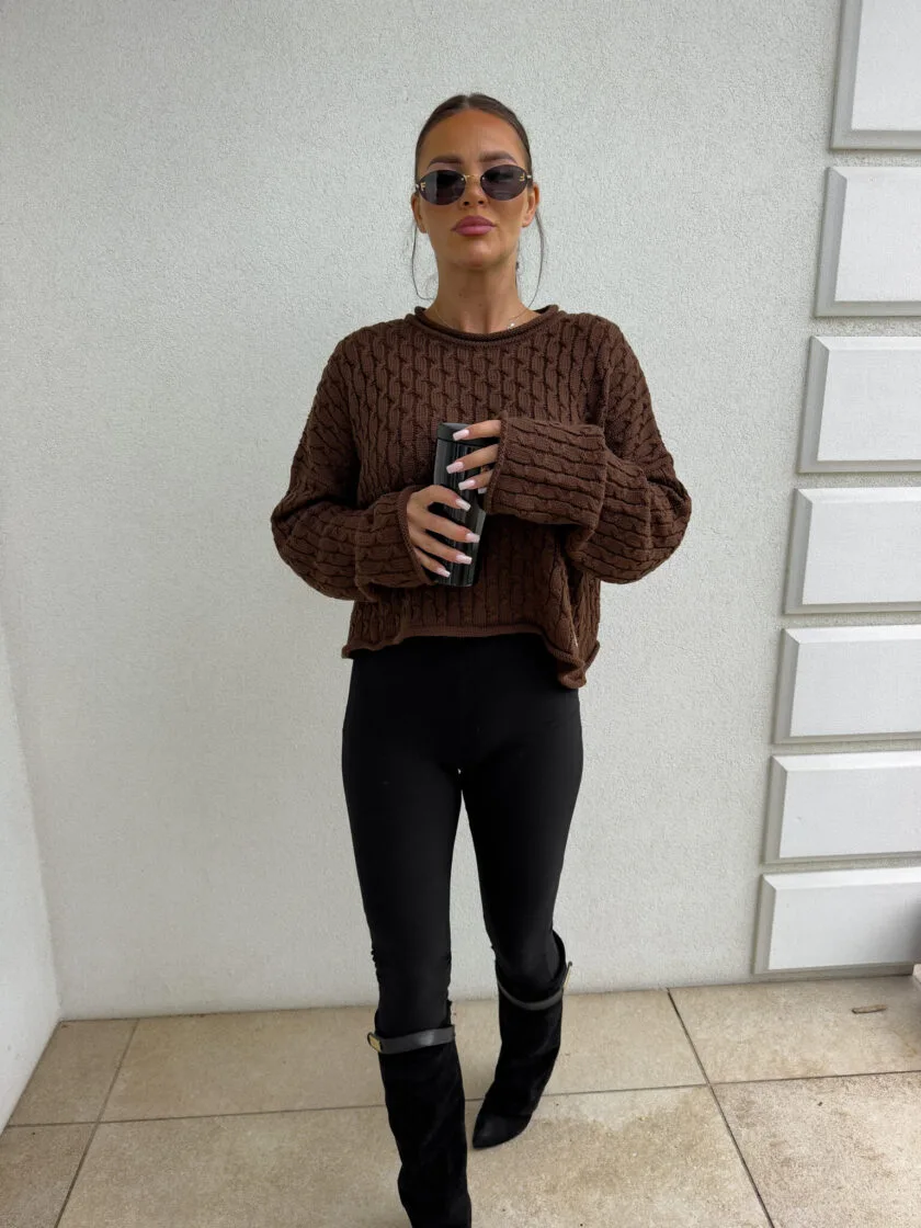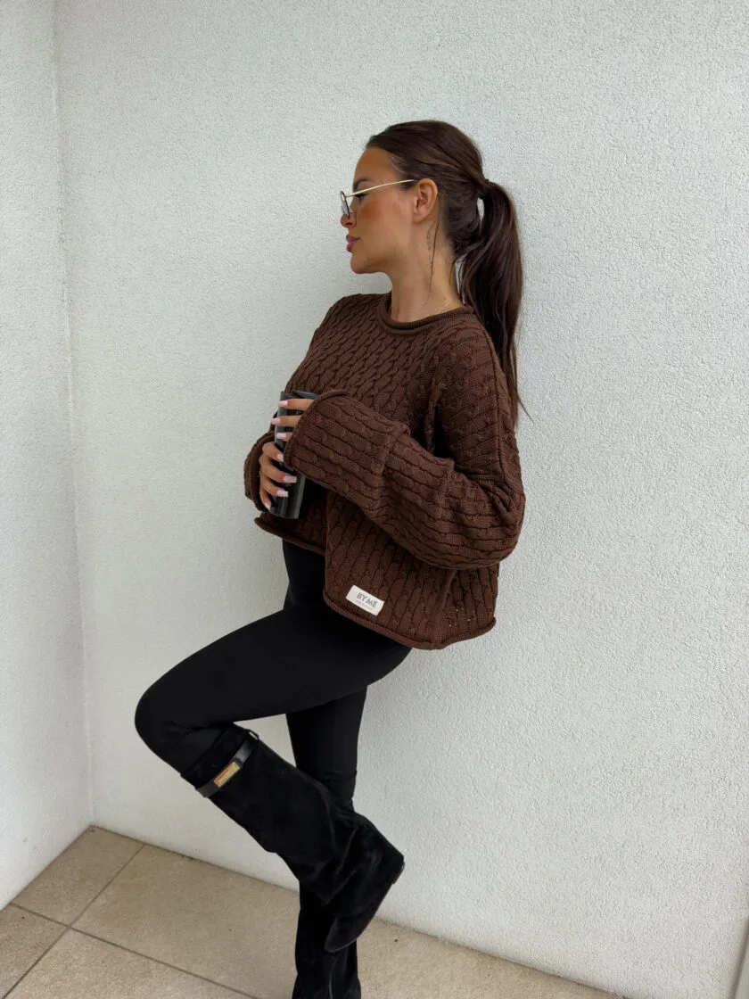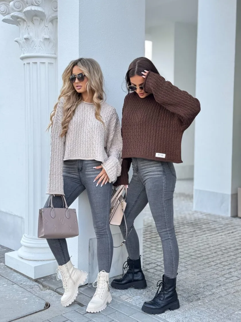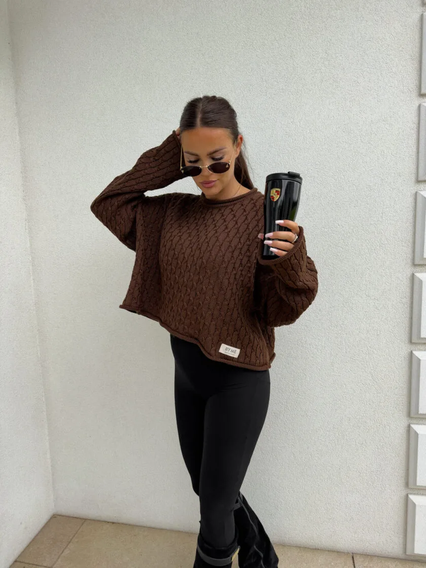 Sweter czekoladowy By Me warkocze to model wykonany z miękkiej, przyjemnej w dotyku dzianiny o pięknym klasycznym splocie w warkocze. Sweter ma luźny, oversize’owy fason, który zapewnia komfort noszenia i modny look. Rękawy są lekko luźne, lekko poszerzane. Dostępne jest kilka kolorów tego świetnego modelu Warkocze – beżowy, czekoladowy oraz intensywna fuksja. Rewelacyjnie się komponuje z jeansami rurkami slim fit, jak i z luźniejszymi mom fit.