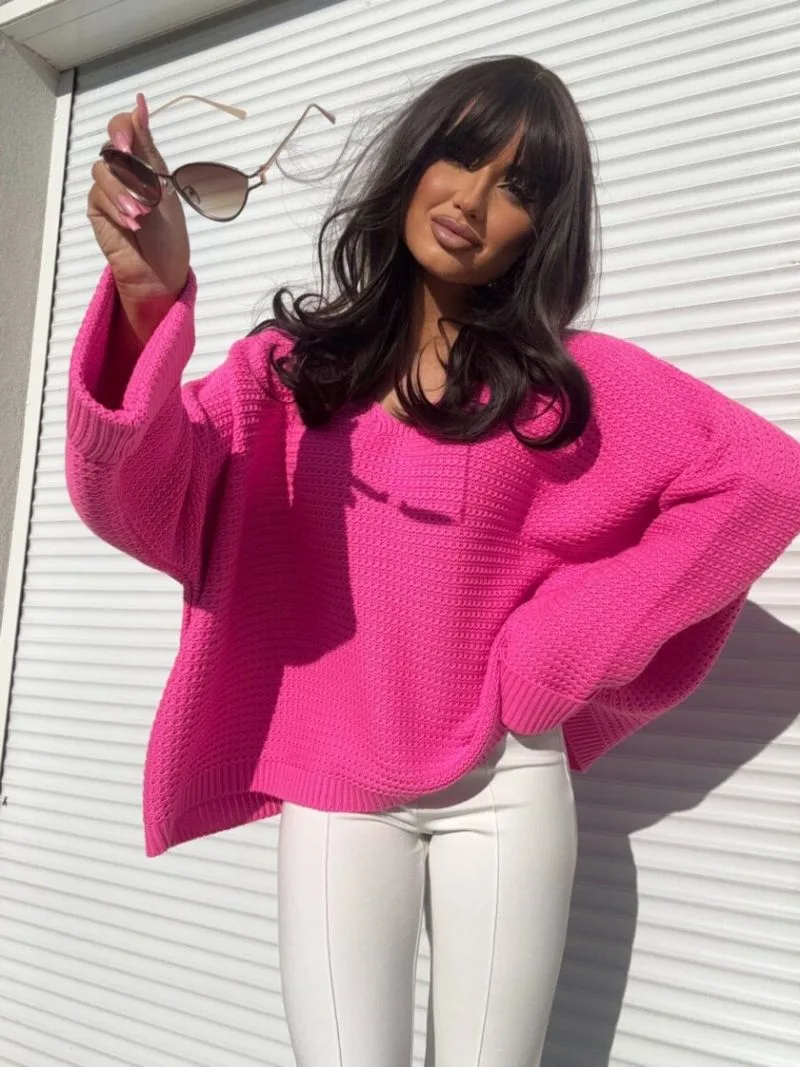 Sweter dzianinowy Olena barbi róż zakładany przez głowę, z długimi rękawami i dekoltem w serek to klasyczny wybór, który łączy elegancję z komfortem. Wykonany z miękkiej, elastycznej dzianiny, zapewnia wygodę przez cały dzień. Dekolt w serek dodaje lekkości i subtelnej kobiecości, podkreślając sylwetkę. Dzięki prostemu, ale ponadczasowemu krojowi, sweter ten doskonale sprawdzi się zarówno w casualowych, jak i bardziej eleganckich stylizacjach. Idealny do noszenia na co dzień, świetnie komponuje się z jeansami, spódnicą czy eleganckimi spodniami.