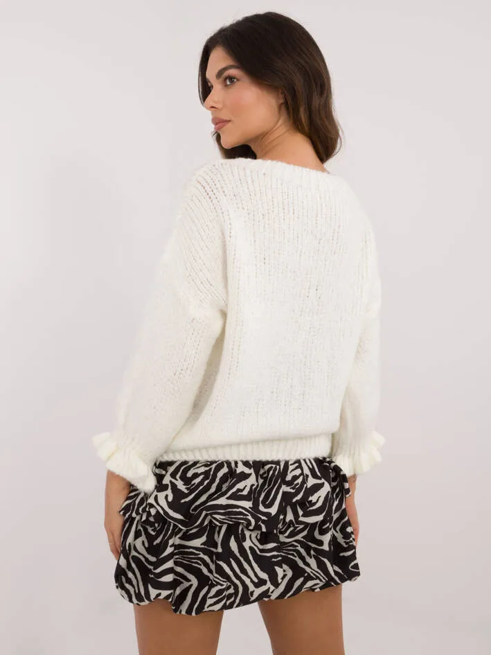 Sweter ecru z falbanką został uszyte we Włoszech.