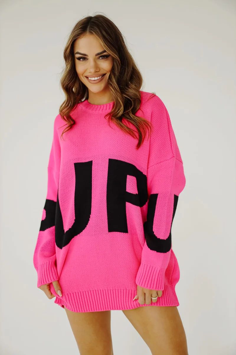 Ciepły sweter damski z grubej dzianiny z długim rękawem. Fason lekko oversizowy, okrągły dekolt. Długość za pośladki, z przedniej i tylnej strony napisy. Rękawy wykończone ściągaczami. Młodzieżowy, collegowy styl dla dziewczyn i kobiet lubiących sportowe stylizacje i zabawę modą w stylu ulicznym. Idealnie sprawdzi się do szkoły, na uczelnię, na spacer lub spotkanie z przyjaciólmi. Dostępny w kilku wersjach kolorystycznych na sezon jesień-zima 2023/2024.