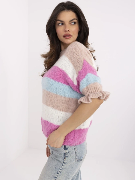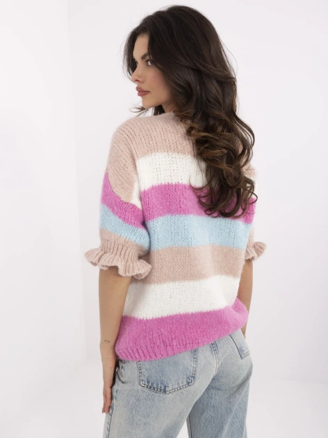 Sweter w paski beżowy z rękawkiem 3/4 zakończonym uroczą falbanką. Paseczki w pastelowych kolorach wpisują się w najnowsze, wiosenne trendy modowe. Fason sweterka jest luźny i będzie dobry na Panie w rozmiarach od XS do L. Delikatna, pastelowa kolorystyka sprawi, że sweterek będzie pasował do wielu stylizacji, a jego kolory będą wyróżniały się na tle innych. Falbanki na rękawach dodają lekkości i kobiecości.