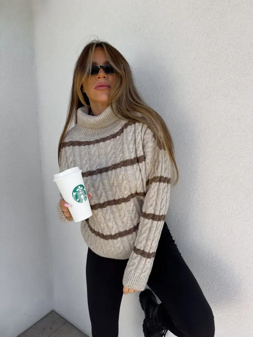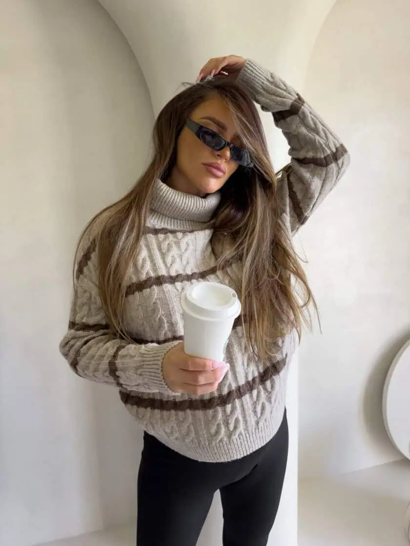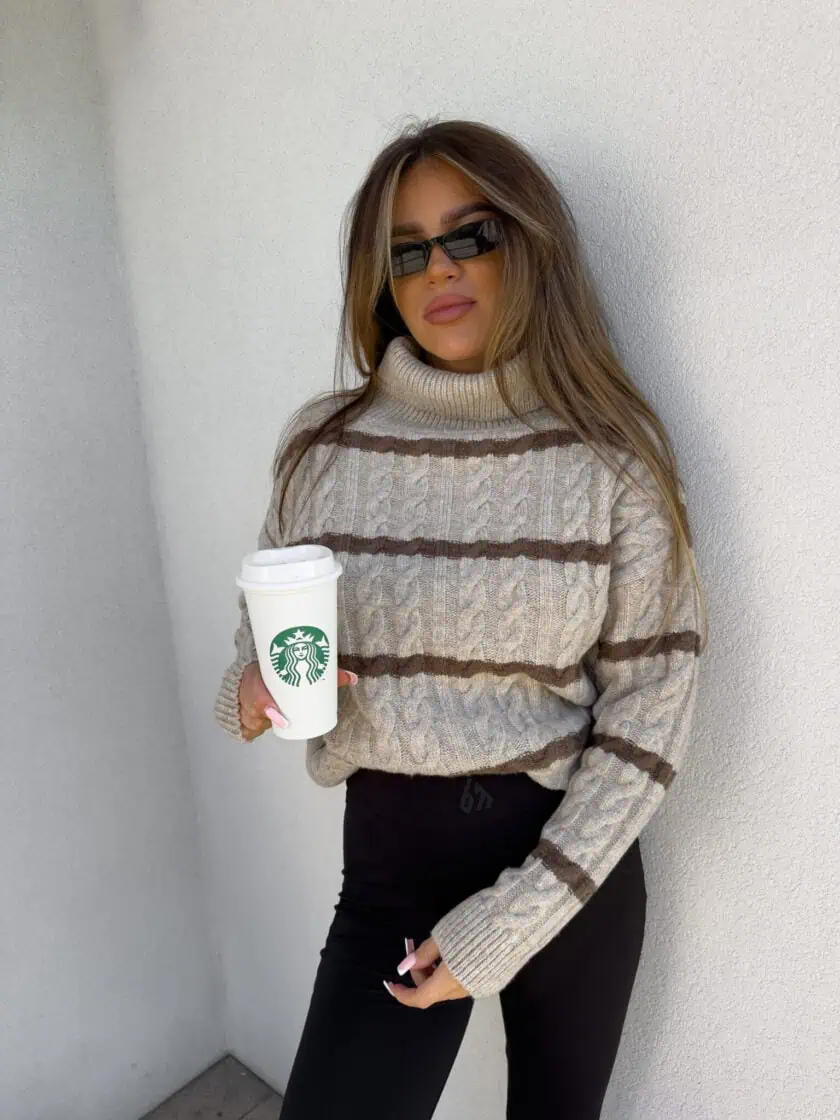 Sweter z golfem By Me Inko w pasy beż-czekolada, wkładany przez głowę, na długi rękaw z ciekawym splotem, klasyczny krój. Bardzo ciepły ( w składzie 50% wełny).