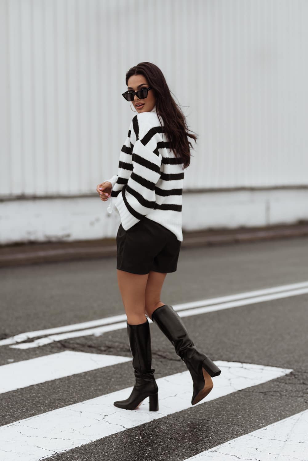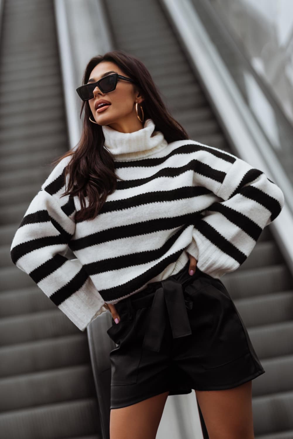 Modny sweter damski z golfem STRIPES to połączenie klasycznego stylu i komfortu noszenia — idealny na chłodniejsze dni w sezonie jesień-zima. Stylowe paski w kontrastowych kolorach czarnym i białyn dodają charakteru każdej stylizacji i sprawiają, że sweter wygląda efektownie, a jednocześnie uniwersalnie.